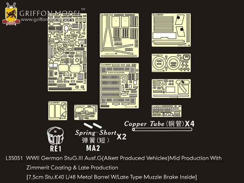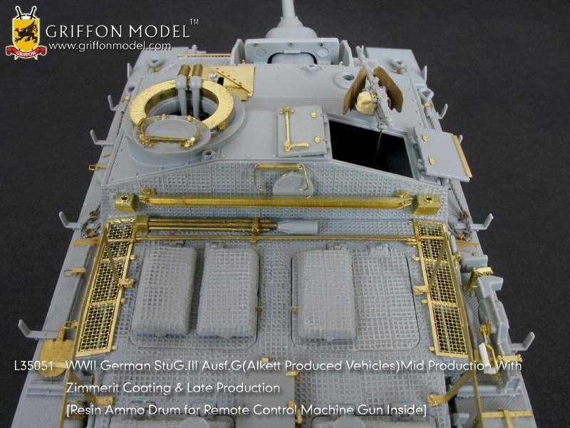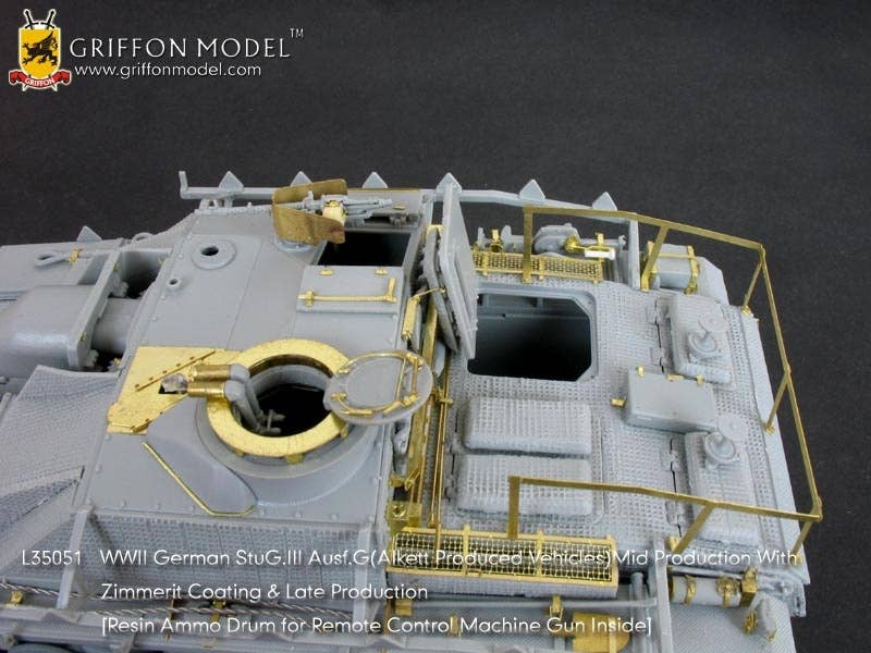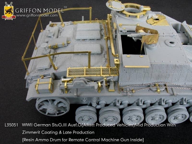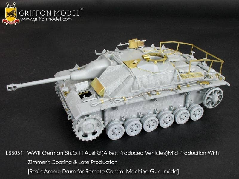 A set of high-quality photo-etched parts for the 1/35 StuG..III Ausf.G (Alkett Produced Vehicles) Mid Production with Zimmerit Coating & Late Production kit by Dragon (6633/6593). Base kit not included.
