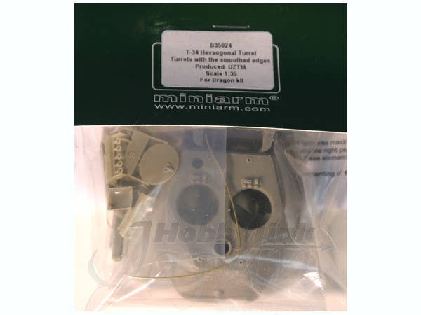 This is a replacement and conversion set for the Dragon T-34 kit, featuring a resin T-34/76 model 1942 hexagonal turret with smooth edges, accessories, and a finely crafted metal main gun barrel, as pictured below.