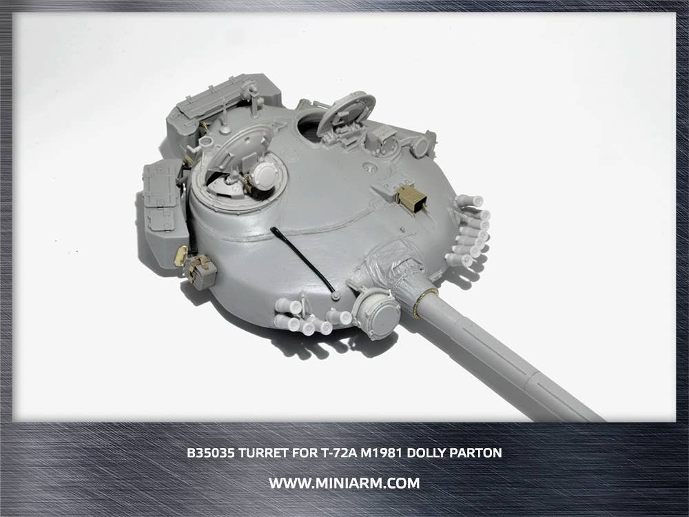 This set of sharply cast resin parts from Miniarm builds into a 1/35 T-72A Turret Dolly Parton m1981 for use with Tamiya kits. Base kit not included. Order today!