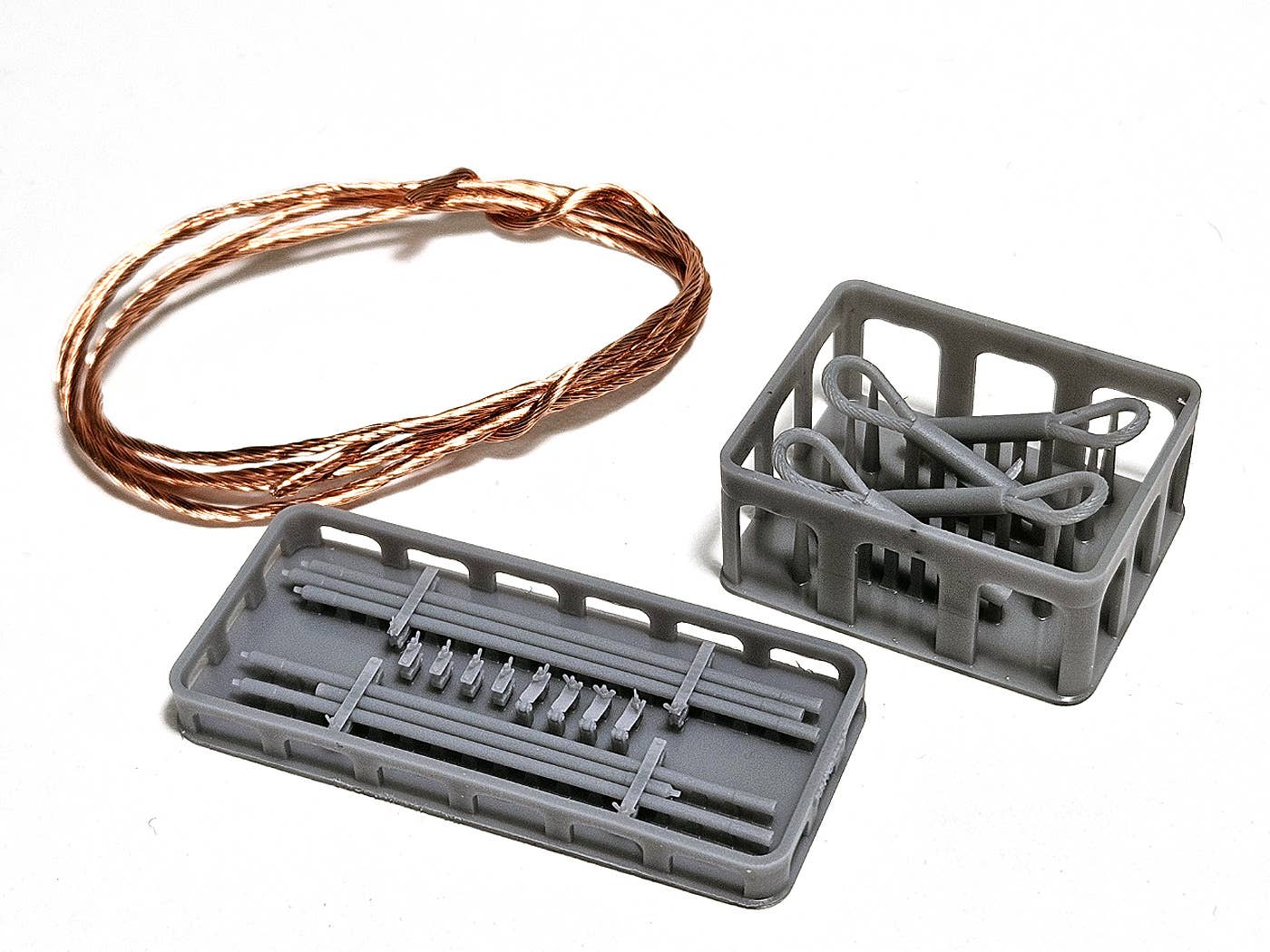 The set includes two towing cables, featuring 3D-printed tow eyes and metal wire for the cable sections. The cable holders and clamps used to secure the cables to the hull are also 3D-printed, with the holders integrally molded with cleaning rods.