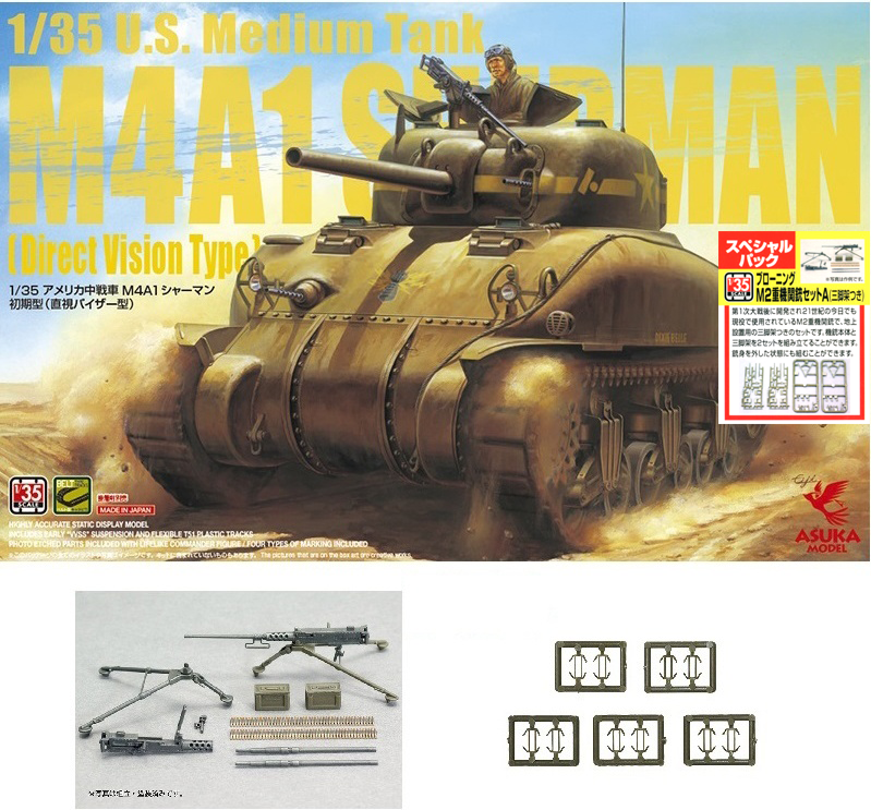This special edition of the excellent Asuka 1/35th scale Sherman tank includes the separately sold Browning M2 Machine Gun Set A with Tripod and Periscope Guards for US Tanks.