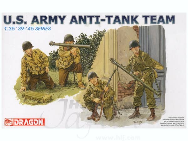 Set of four figures equipped with the famous "Bazooka" M1 and M9 anti-tank rocket launchers and M1 rifle M9A1 anti-tank grenades. Two figures crouching are in M1941 uniform. Other two figures are in M1943 uniform. Sharp crisp detail throughout. Lots of extra small fire arms are included, too.