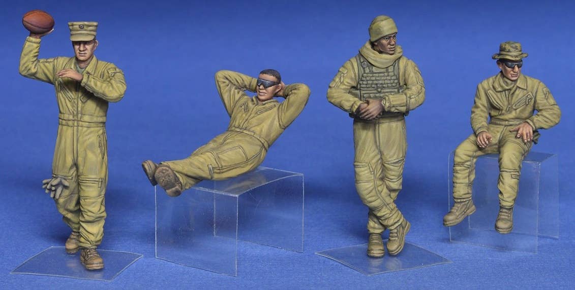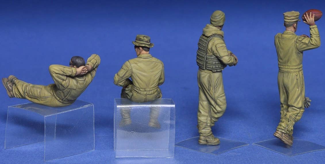 This plastic model kit builds four 1/35 scale lounging USMC tank crew members.