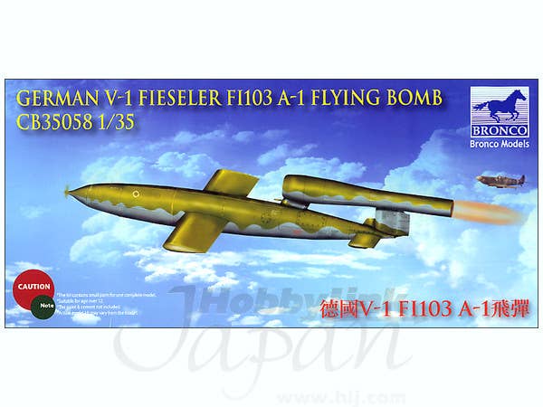 A 1/35-scale kit of the V-1 flying bomber. A ground transport dolly is also provided. Includes decals for stencils.