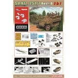 This model kit from Dragon can be built as any of three types: the normal armored engineer transport vehicle type, a type equipped with a 2.8cms.PzB41 anti-tank rifle instead of the MG42 in front, and a command vehicle type equipped with a Fu5 communication device and a star antenna. The unique body shape of the 251/7 and the assault bridge are carefully reproduced; the assault bridge is slide-molded for accurate reproduction of the shape and mounting brackets. In addition, parts such as a 2.8cm anti-tank rifle, Fu5 communication device and star antenna are highly realistic. Accessories such as tools for engineers and equipment such as mines are also included. The tool box on the side of the vehicle can be assembled opened or closed; the canvas that covers the rare part of the open-top body is made of DS material with a rich texture. Dragon's own EZ Track parts are included as well (the initial type of tracks are also included). Place your order today!