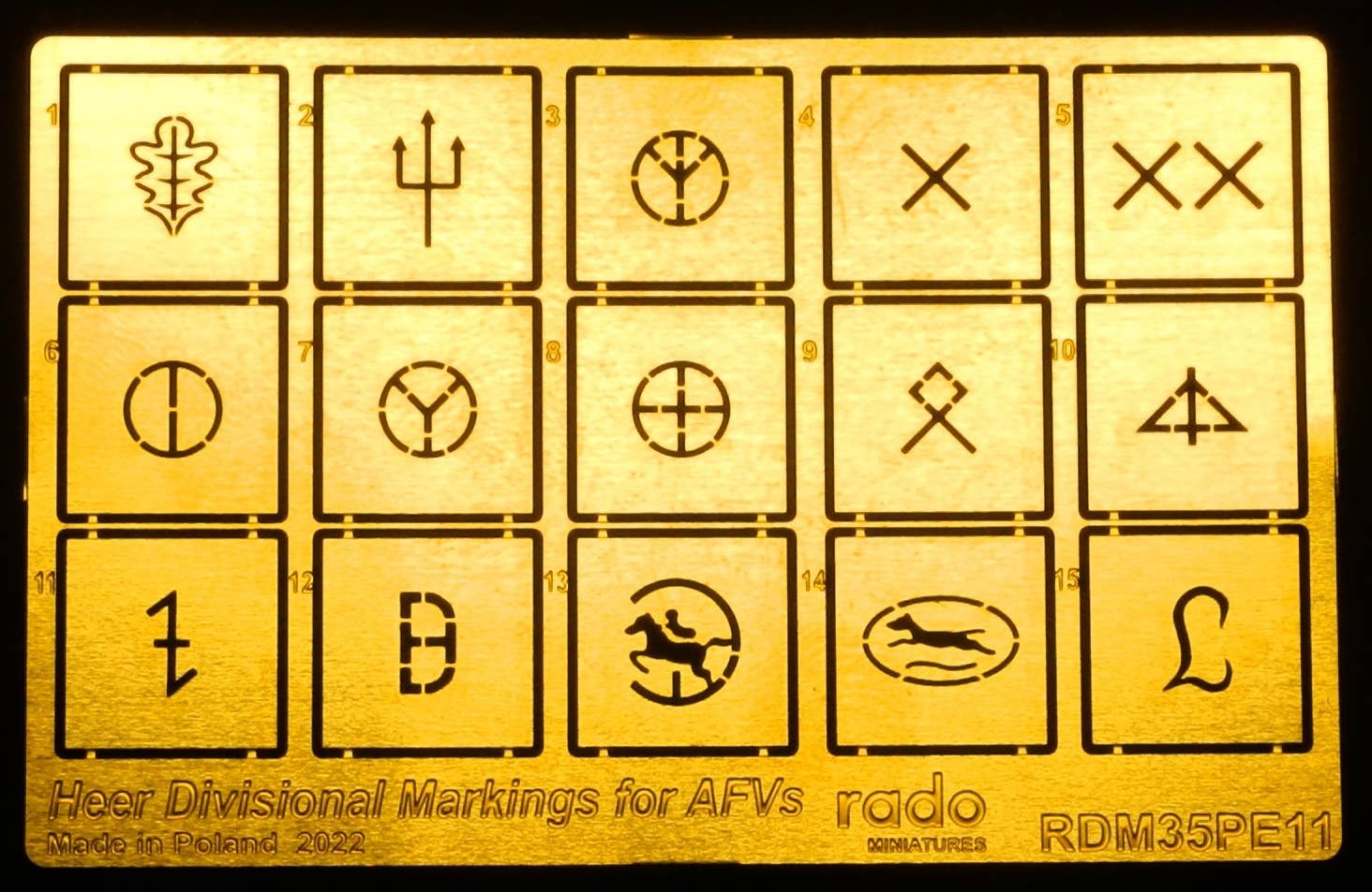 This is a sheet of etched templates of the markings of the divisional emblems of the divisions operated by the Wehrmacht in World War II! Put the marking on top of the kit and use an airbrush to paint over it. The result will be a precise and beautiful! Order today!