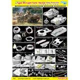 This model kit from Dragon models the initial production type of the Type 95 Ha-Go tank. Extensive slide molds are used to accurately reproduce the shape of its uniquely designed body, which has been scaled down by measuring the actual vehicle, as well as the turret and cupola. The details of the bolts on each part are delicately expressed. The seesaw type interlocking suspension is fully realized, and don't miss the details of the road wheels and sprocket wheels! A belt-type DS track is included for ease of assembly; the lower part of the hull is also easy to assemble with an integrated slide-molded part. The kit also includes a tank soldier figure for the cupola. It could star in dioramas set anywhere from jungle areas to urban areas -- order yours today!