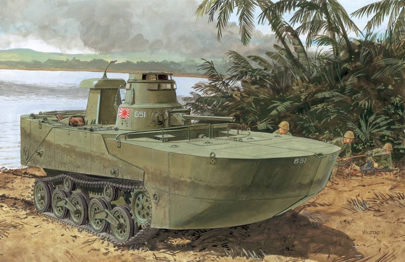 In World War II, the Japanese Navy, with the cooperation of the Army, developed and equipped the amphibious tank Special Type 2 internal fire boat (Kami). The base was the Army's Type 95 light tank, which had a fully welded structure, and the hatch was equipped with a rubber seal. The turret uses the Type 2 tank's turret, and it was equipped with a set of 37mm tank guns. It was equipped with detachable floats to obtain buoyancy on the front and rear of the hull. There were two types of floats -- the early model and the late model -- and the latter was categorized by the left and right split type, unlike the early version, which was integrated. Carried to the coast by submarine to the southern islands where harbor facilities are insufficient, they then sailed on their own to land. After landing, the floats were removed and the tanks continued to advance like normal tanks. After being formalized in 1942, about 180 of this unit were produced by the end of the war, including both early and late models. It was put into combat for the first time in Saipan, and was active in southern areas such as New Guinea; it was also used in the fierce battle of Iwo Jima.