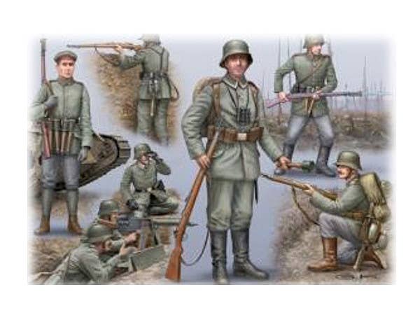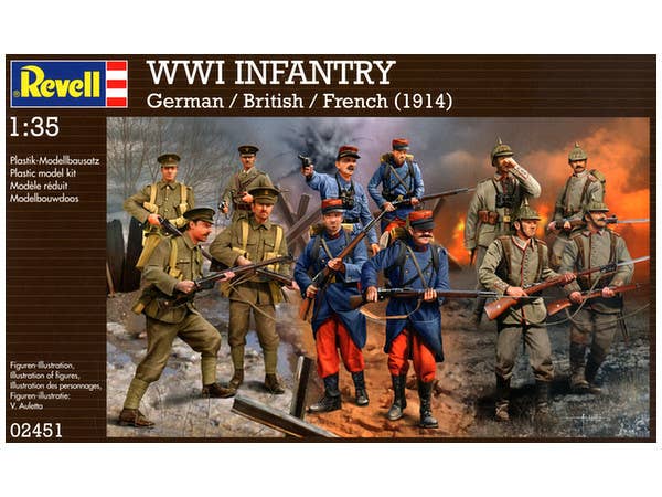 This model kit contains parts to build four German, four British, and four French infantrymen with equipment and clothing for the year 1914. A wide range of accessories such as guns and other equipment allow for the individual customization of the figures. Features authentic poses, finely-detailed facial features, and realistic clothing.