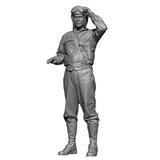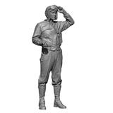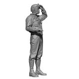 This resin figure depicts a WWII U.S. tank commander in a vigilant stance, modeled standing with his right hand on the tank's cupola and lifting his goggles with his left hand to scan the front. The figure captures a natural pose and includes detailed accessories such as a pistol holster on the left chest. While it can be displayed on its own, it is particularly effective when paired with a fully equipped same-scale M4 Sherman tank or similar models.