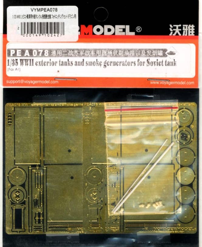 Heighten the detail of your 1/35-scale WWII Soviet tank kit even further with these precisely photo-etched frets of metal exterior tank and smoke generator detail parts. Another fine offering from Voyager Model of China!