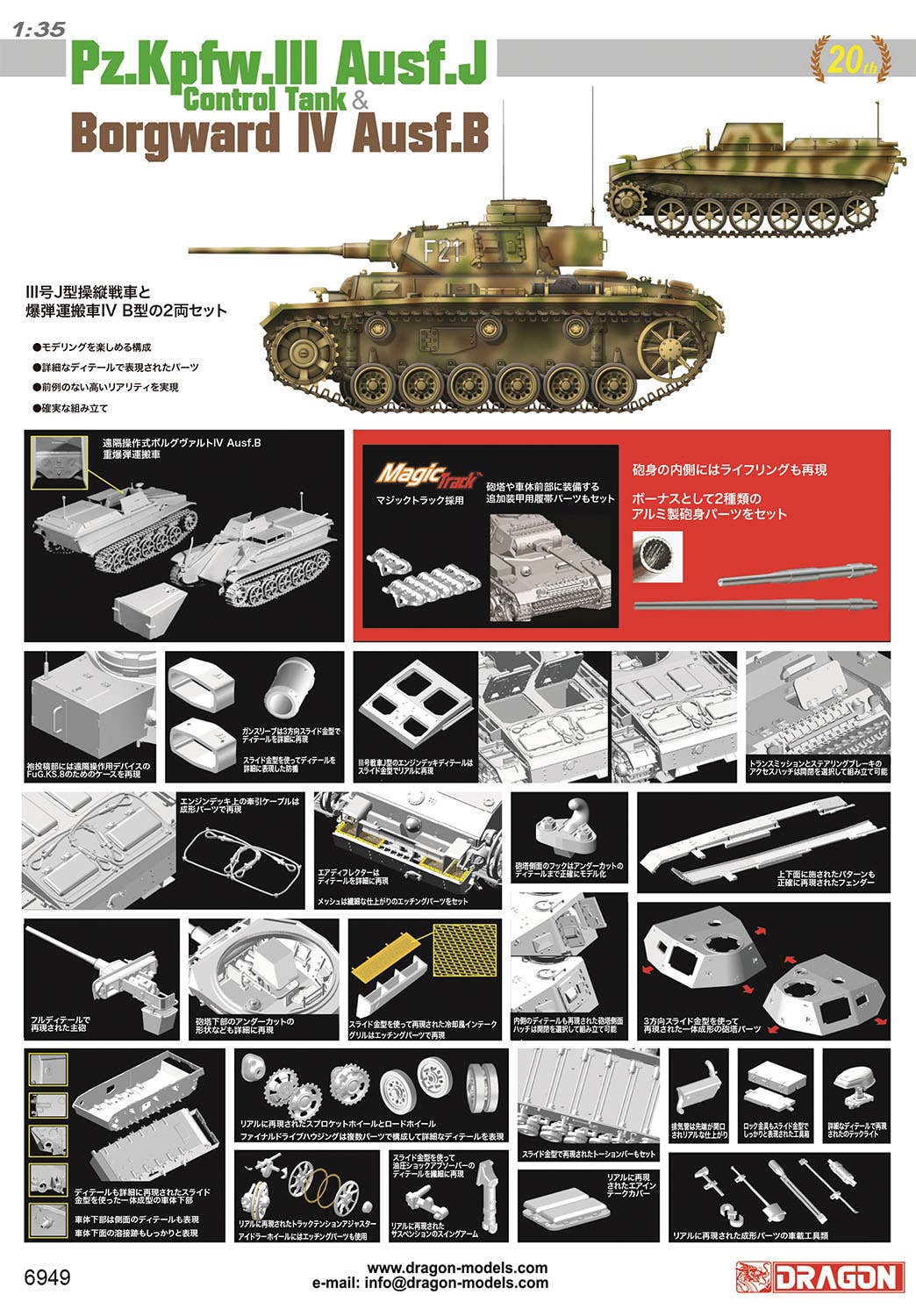 A powerful duo recreated in 1/35-scale! Dragon brings us a model kit of the Panzer III and Borgvald IV Ausf. B! The Panzer III is recreated as the Asuf. J; also included is a rear turret accessory box housing the Borgvald's remote control system. The Panzer III features Magic Tracks, and two aluminum gun barrels are included: the 42-caliber KwK.42 and the 60-caliber KwK.60. Photo-etched parts are included to enhance the sharp finish. Order it for your own collection today!