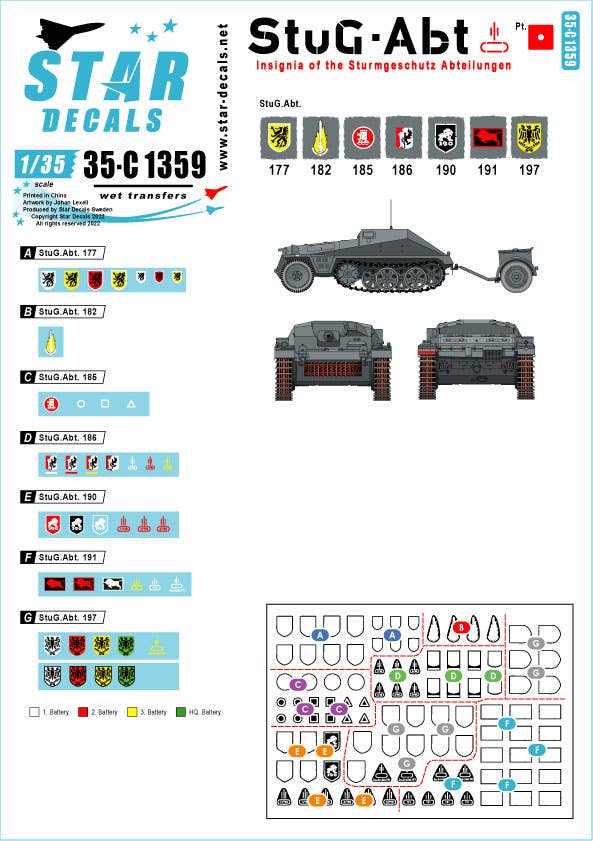 This collection contains unit insignia filled in on vehicles such as the III assault gun and Sd.Kfz.252 ammunition carriers belonging to German assault gun battalions.The seven units included are the 177th, 182nd, 185th, 186th, 190th, 191st, and 197th Assault Gun Battalions, and artillery company markings in different colors are also provided for each battalion.