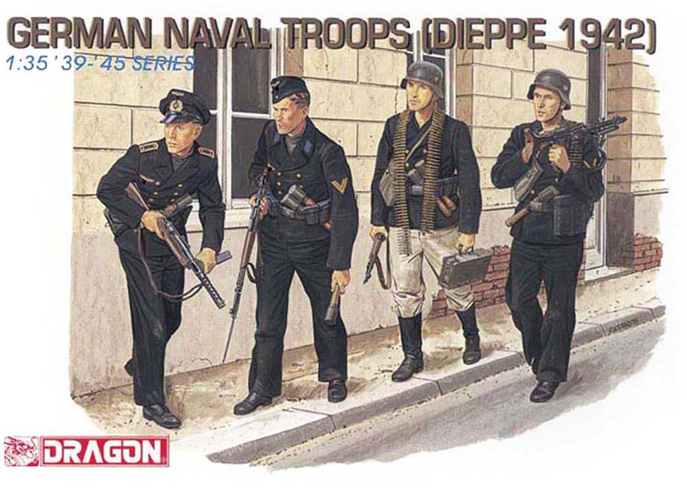 Dragon brings us a set of four 1/35-scale German Navy infantry soldiers, who served with distinction during World War II! These troops participated in the fighting at Dieppe, where the Allied landing operations took place in 1942. The figures feature taut poses to capture the tension of advancing through an urban environment while keeping a vigilant watch on their surroundings. The commander figure, depicted aiming an MP28 submachine gun, wears an M1938 peaked cap (NCO type) and a pea jacket. A soldier wearing a field cap holds a Kar98K rifle fitted with a bayonet, while a helmeted machine gunner walks with an MG34 slung over his shoulder. This figure set is particularly appealing for its accurate depiction of the unique uniforms worn by the Naval infantry. The wide array of equipment, including MG28/11 ammunition pouches and hand grenades, has also been meticulously recreated. Order yours today!