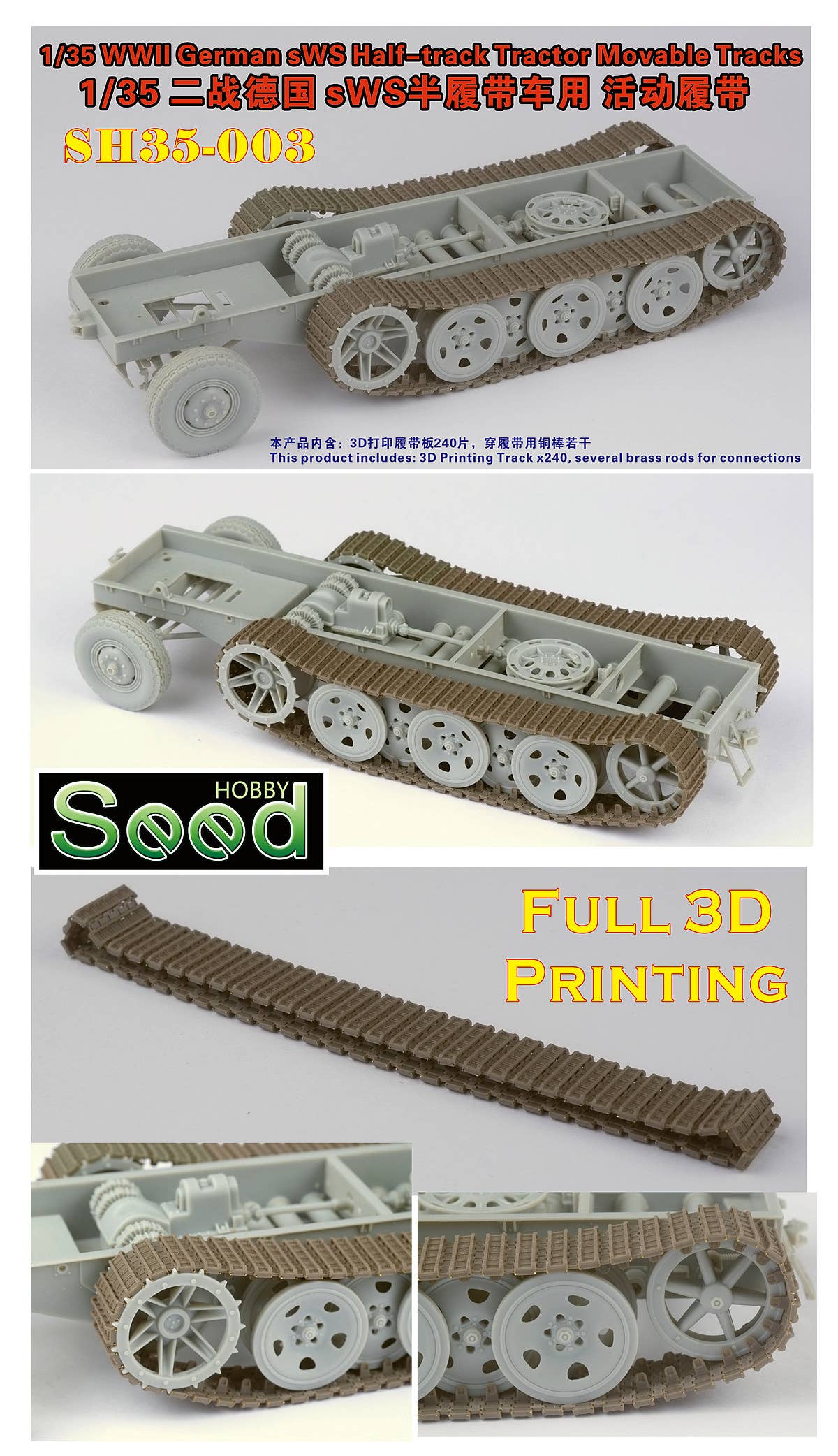 This 3D-printed upgrade set features finely detailed movable tracks for the WWII German sWS half-track tractor, designed specifically for the Bronco model kit. Ideal for modelers seeking enhanced realism and articulation in their builds.