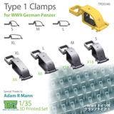 This is a 3D-printed detail part reproducing clamps used to secure external equipment on German military vehicles such as tanks and armored cars during World War II. The Type 1 model represents the early-war version with rivets on the surface.