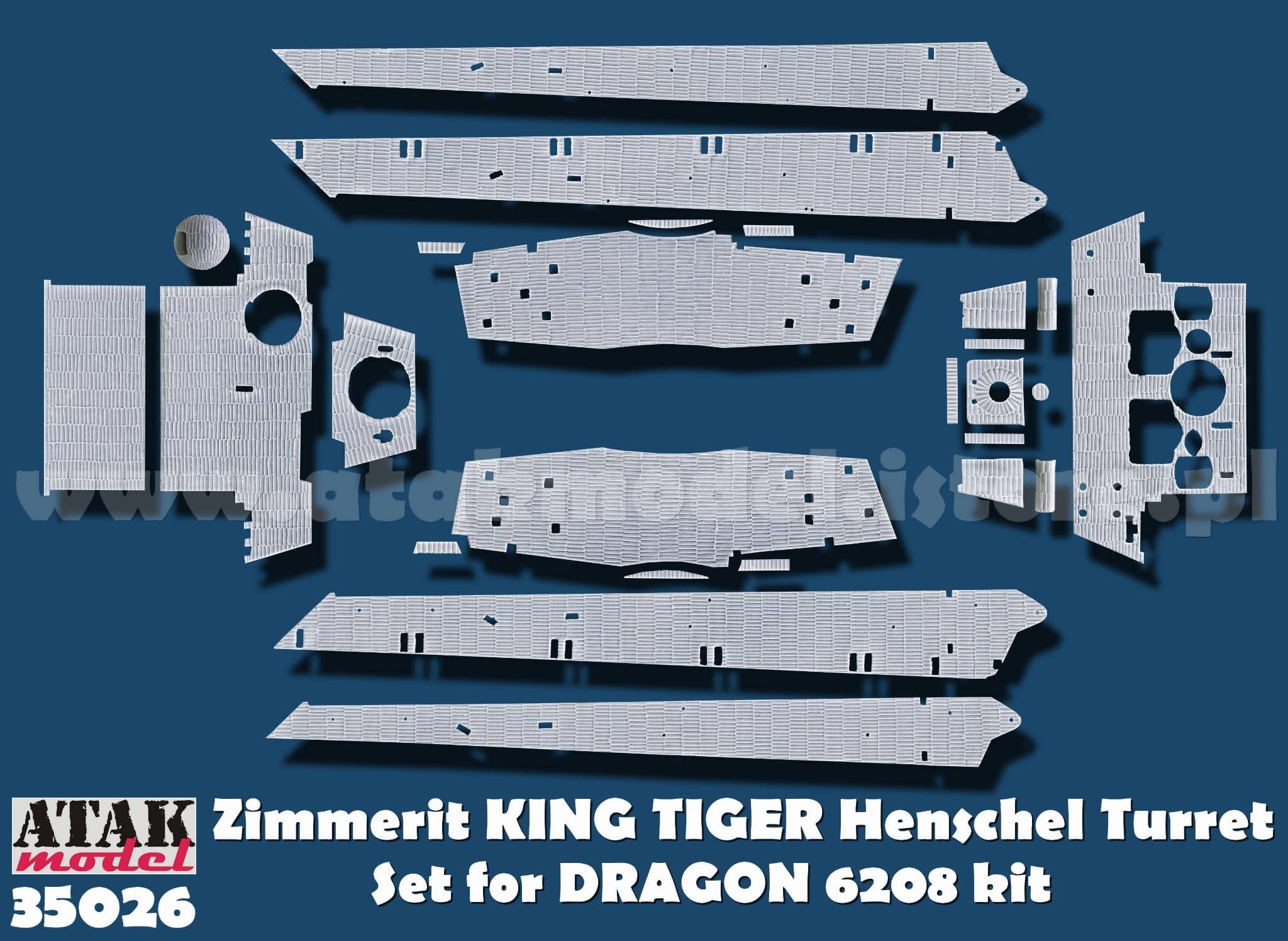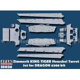 This set allows you to replicate the Zimmerit coating applied to the Henschel turret type (production turret type) of the German King Tiger (Tiger II) heavy tank during World War II. Resin parts are affixed to the armored surfaces of various kit components. Resin parts are provided to replace kit parts for components with complex and challenging-to-apply surfaces, such as the ball mount for the hull machine gun.