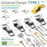 This is a 3D-printed detail part reproducing clamps used to secure external equipment on German military vehicles such as tanks and armored cars during World War II. The Type 1 model represents the early-war version with rivets on the surface.