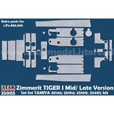 This set allows you to replicate the Zimmerit coating applied to the mid and late production models of the German Tiger I heavy tank during World War II. Resin parts are applied to the armored surfaces of various kit components. Resin parts are provided to replace kit parts for components with challenging-to-apply surfaces, such as the gun mantlet and side hatches. The turret offers the choice of the coating pattern applied to vehicles of the 505th Heavy Tank Battalion.