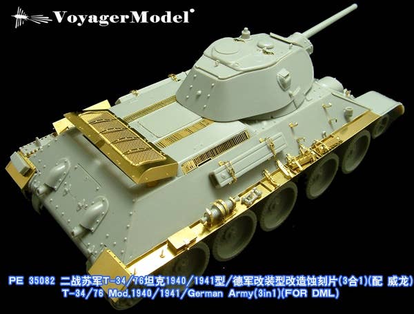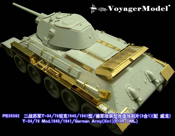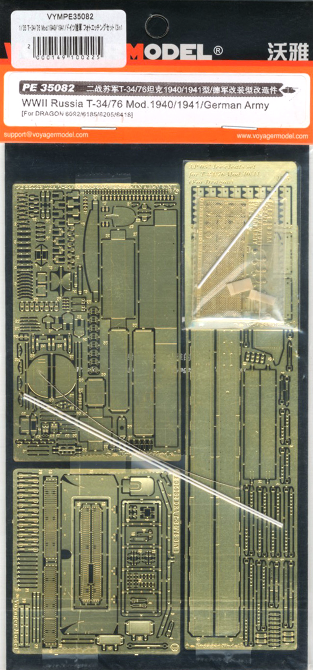 Heighten the detail of your Dragon 6092/6185/6418 1/35-scale WWII Russia T-34/76 Mod. 1940/1941/German Army kit even further with these precisely photo-etched frets of metal detail parts. Another fine offering from Voyager Model of China!