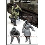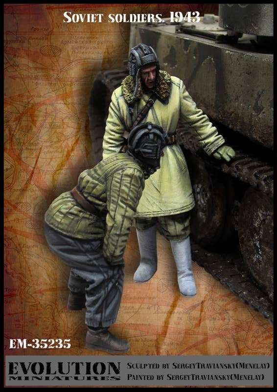This two-pack figure set reproduces a Soviet Red Army soldier surveying the undercarriage of a captured German Tiger tank in the winter of 1943. One is a soldier in an overcoat with his left hand resting on the Tiger tank's crawler and gazing at the rolling wheels, and the other is a soldier in a tirograka (quilting), mid-waist, staring intently around the foot of a Tiger tank.