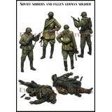 This is a 3-figure set depicting Soviet Red Army soldiers inspecting an StG44 assault rifle held by a fallen German soldier on the Eastern Front of World War II.