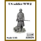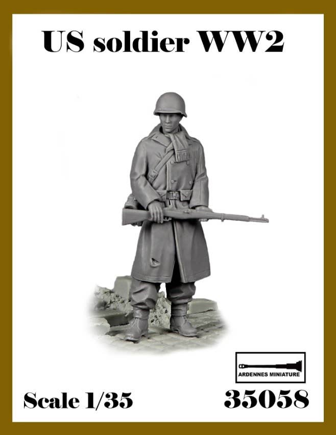 This is a series that replicates the American infantry during the winter on the Western Front in the late stages of World War II, including the Battle of the Bulge. It portrays a US Army infantryman wearing a helmet and an overcoat. He holds an M1 Garand rifle with both hands, assuming a vigilant posture. Attention is paid to the detailing, including equipment such as the bag hanging from the shoulder, the scarf protruding from the collar, and the tears in the coat.