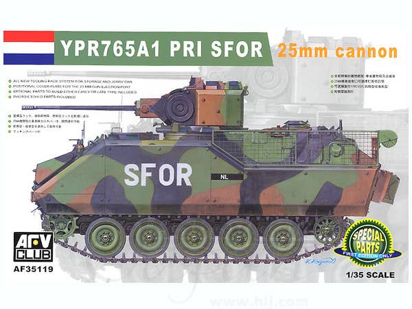 AFV Club's YPR765A1 PRI SFOR version is sharply molded in olive drab styrene, and features all new tooling for the storage rack system and jerry cans, a positional cover plate for the 25mm gun ejection port, and optional parts to build either an early- or late-type vehicle. Includes nylon mesh for the storage racks, a fret of photo-etched metal detail parts, and markings for five different vehicles.