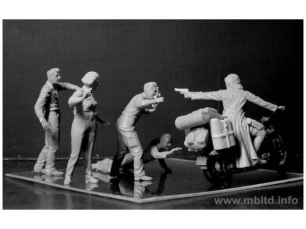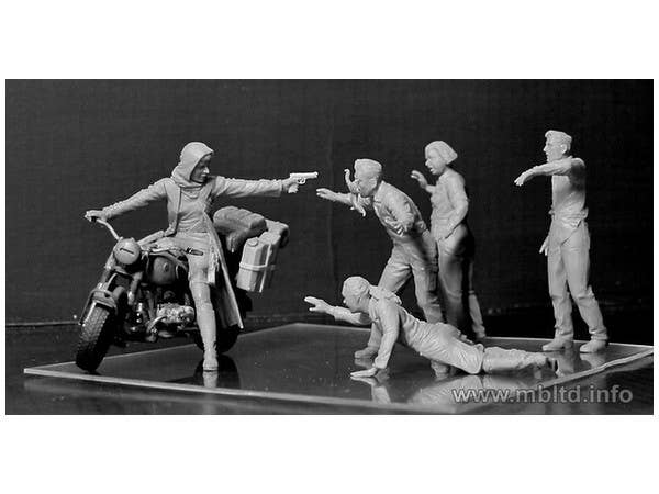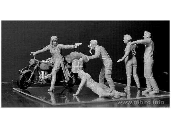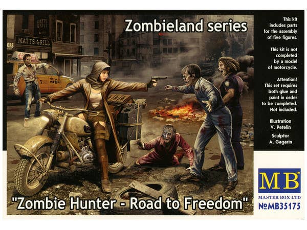 This kit features a female warrior calmly pointing a pistol at a selection of menacing zombies! It should be noted that a motorcycle is NOT included.