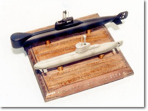 This is a set of WW.II & Modern German small submarines. Type 23 (the white one in the picture) is the 250 tons class small coastal sub buit during 1943 -1945. Type 206A (the black larger one in the picture) was built mid-1970's and have been being in active service probably the smalllest military sub in the world. Both model is made of resin. A simple base, not the wooden one on box picture, is included.