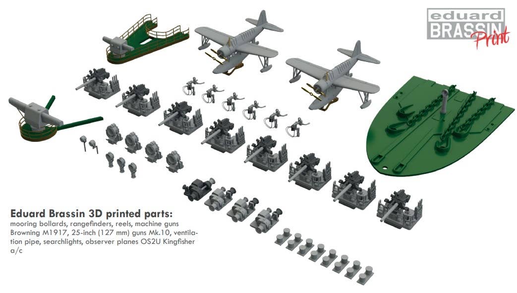 This limited-edition kit of the legendary U.S.S. Arizona from Eduard begins with injection-plastic parts by Hobby Boss! A brass barrel by Master is included, as are photo-etched parts by Eduard; Eduard also provides 3D printed parts for the bollard, searchlight, rangefinder, machine gun, Mk.10 2.5-inch cannon, winch reel, ventilator, and OS2U Kingfisher. Order yours today!