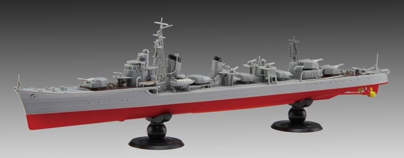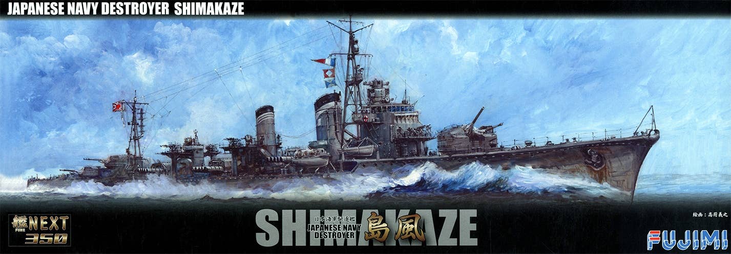 The Imperial Japanese Navy destroyer Shimakaze joins Fujimi's Warship Next model kit lineup! It's molded in black, clear, gray, copper-colored and red plastic, with parts for a base, photo-etched and brass parts, and stickers for the markings.