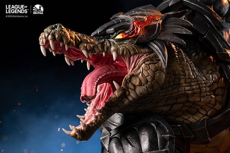 Renekton, the Butcher of the Sands from "League of Legends," is now an amazing 1/4-scale display statue from Infinity Studio! This mighty beast stands up tall, brandishing his unique weapon and growling fiercely to show off his knife-like teeth! His battle-worn armor is intricately sculpted and features a distinct metallic texture for an awe-inspiring sense of presence. His crescent-bladed weapon features a light-up effect that can be set to constant display, or "breathing" mode. His base features the symbol of Shurima fused with golden sand. This assertively sized figure will make a huge impression wherever you choose to display it -- order yours now!