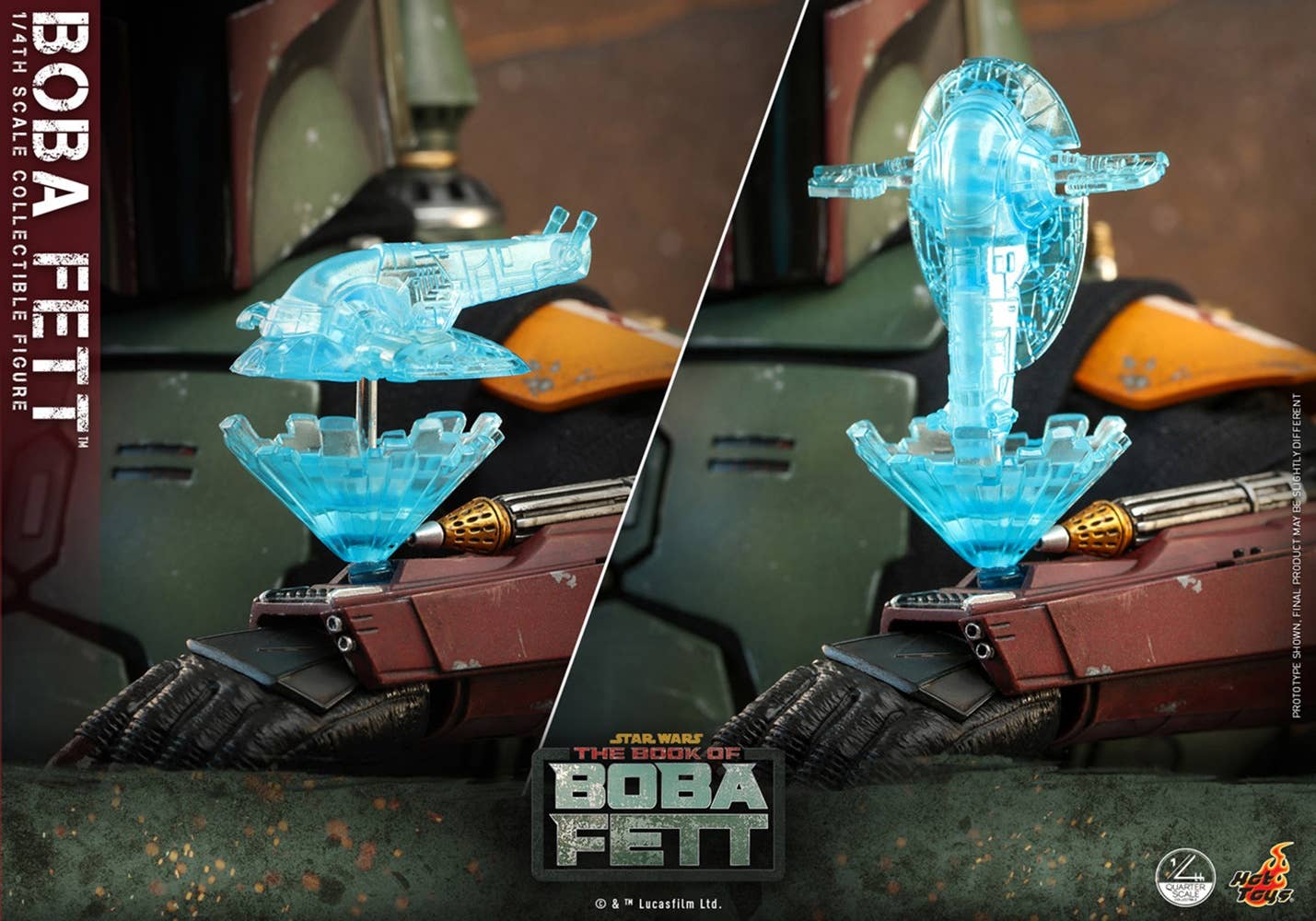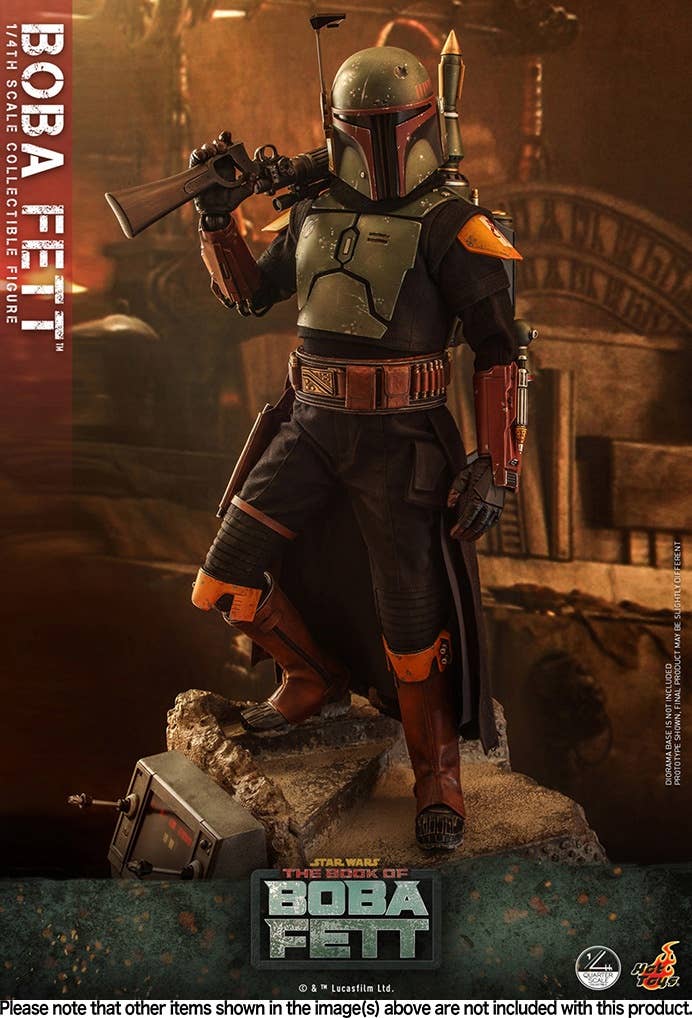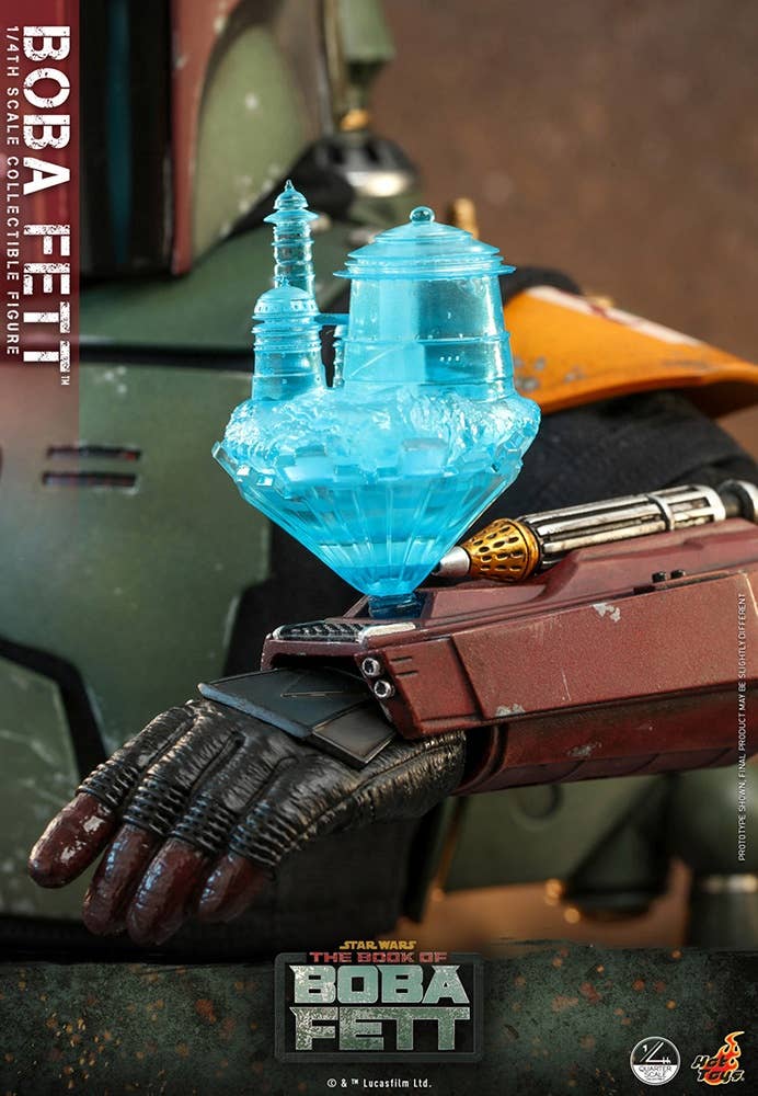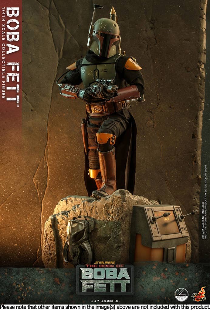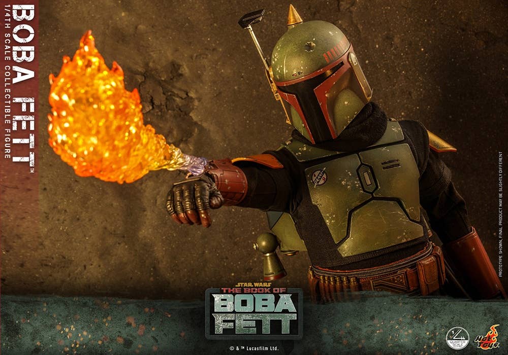 The highly accurate quarter-scale figure is skillfully crafted based on the appearance of the character from "The Book of Boba Fett." It stands approximately 45cm tall, featuring a newly developed head sculpt with an extraordinary likeness, meticulously made armor and interchangable helmet, specially tailored outfit, an attachable jetpack, blaster rifle, flamethrower effect, miniature holograms and a display base.