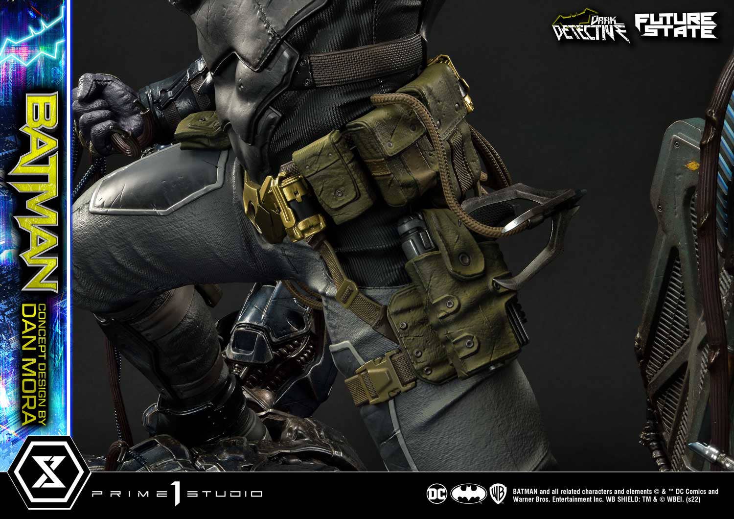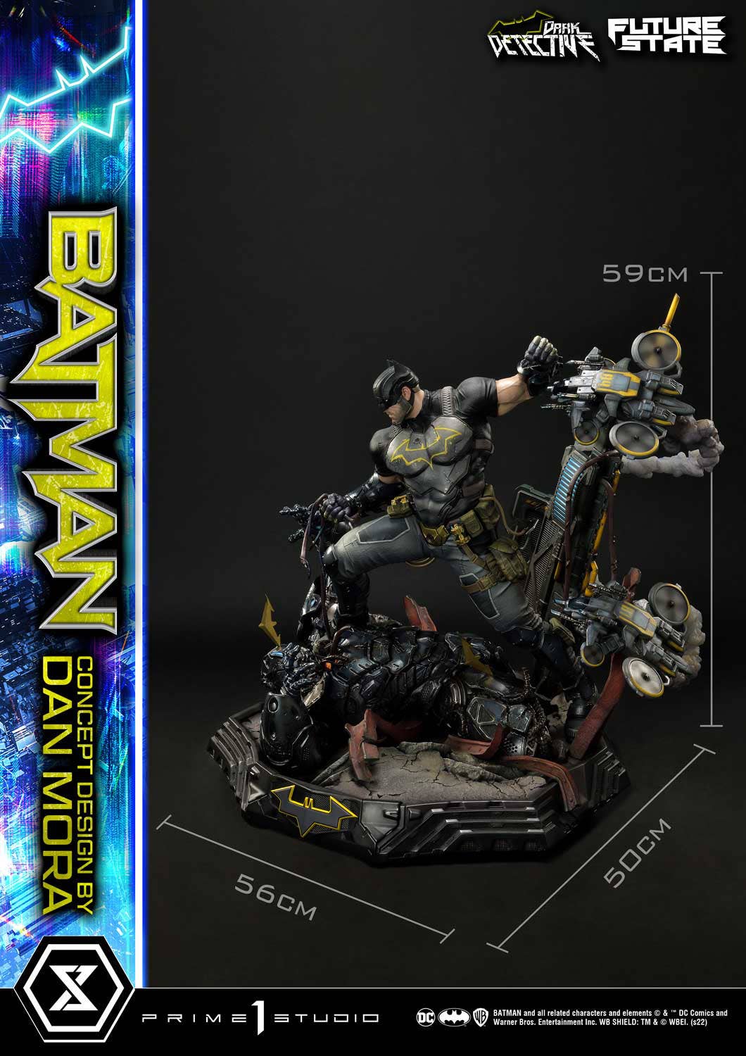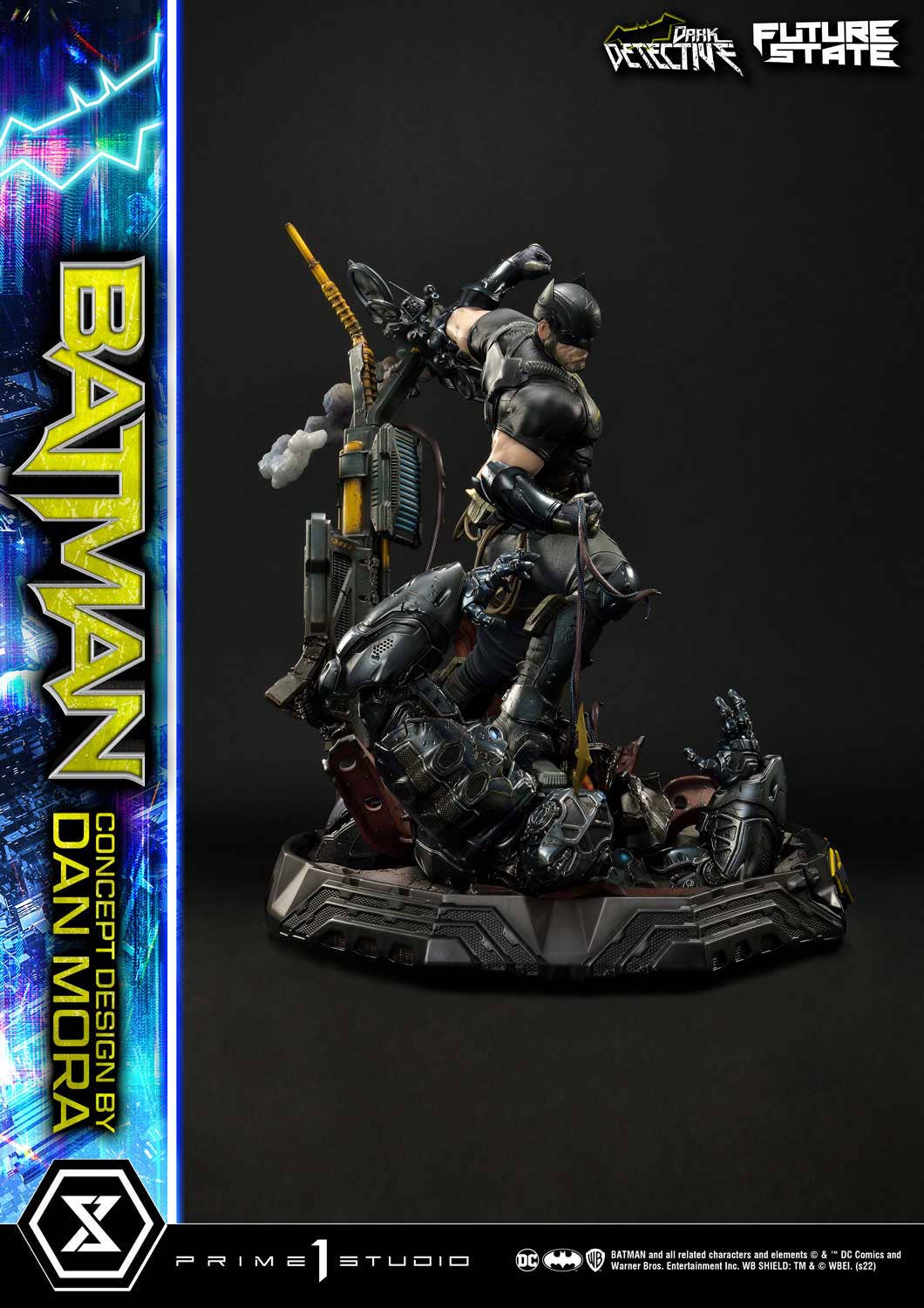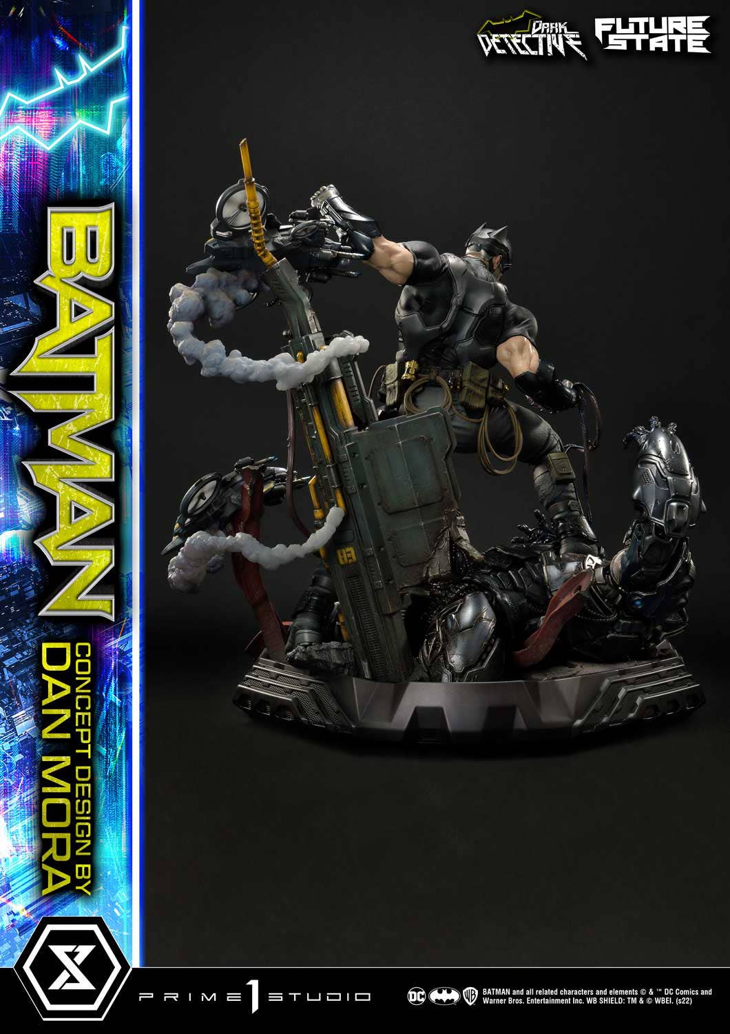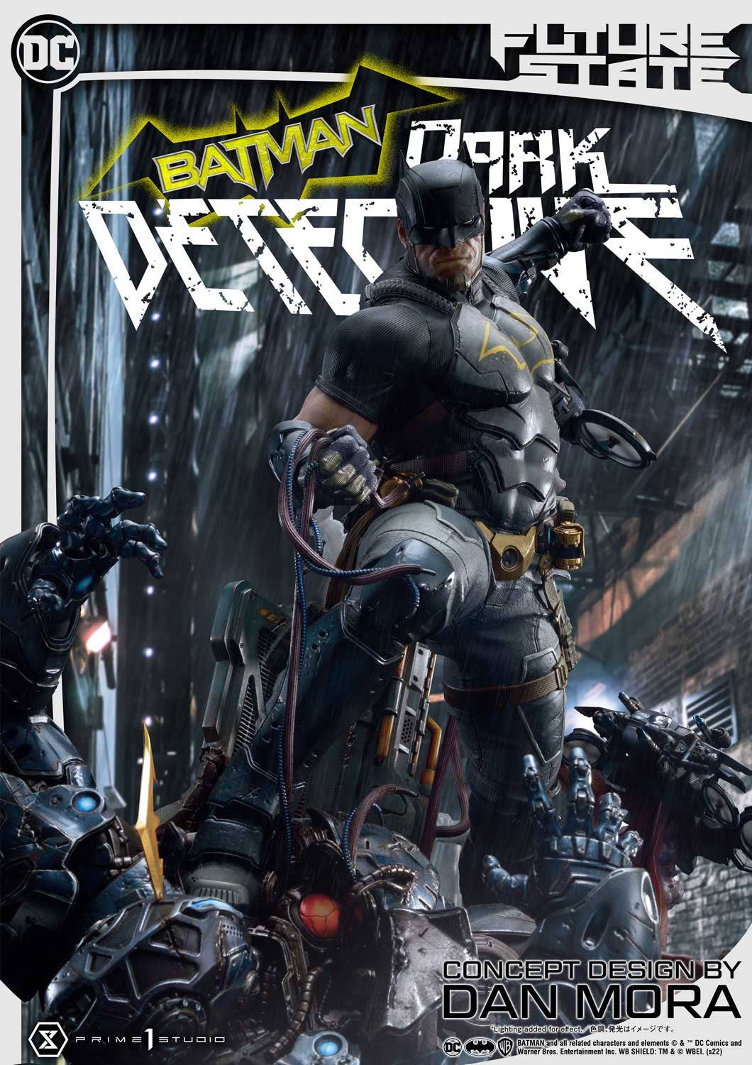 The stage is Gotham City in the DC Multiverse, and the enemy is the mysterious Magistrate. This amazing figure of Batman hails from "Dark Detective" from the "DC Future State" collection of short stories depicting a dystopian future! DC comic book artist Dan Mora collaborates with Prime 1 Studio to bring us this latest entry in the "Ultimate Premium Masterline" series, complete with attack drones emitting white smoke, a defeated humanoid robot, and Batman at the center of the composition, unleashing all-out blows! Batman has removed his coat to expose his high-tech bodysuit complete with plate armor; the texture of each part is reproduced without compromise, and the weathering and contrast in the paintwork is perfect. A military-like pouch and a holster are included that can be attached to the waist belt, too. Even the defeated Magistrate lying at his feet is highly detailed. Order this awesome presentation for your own collection today!