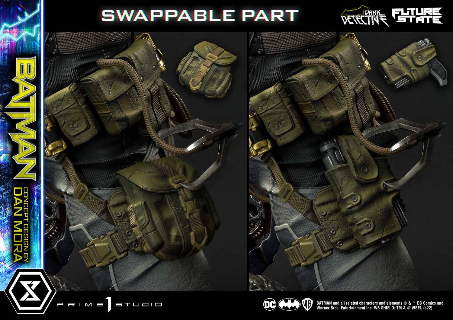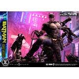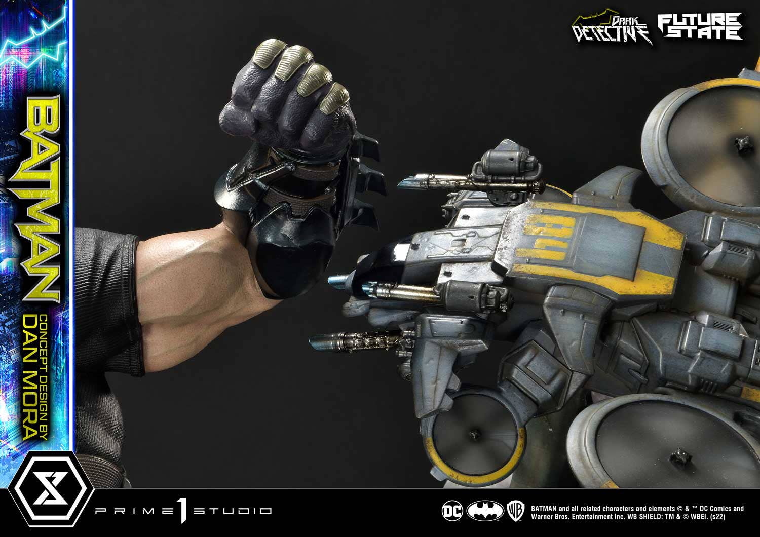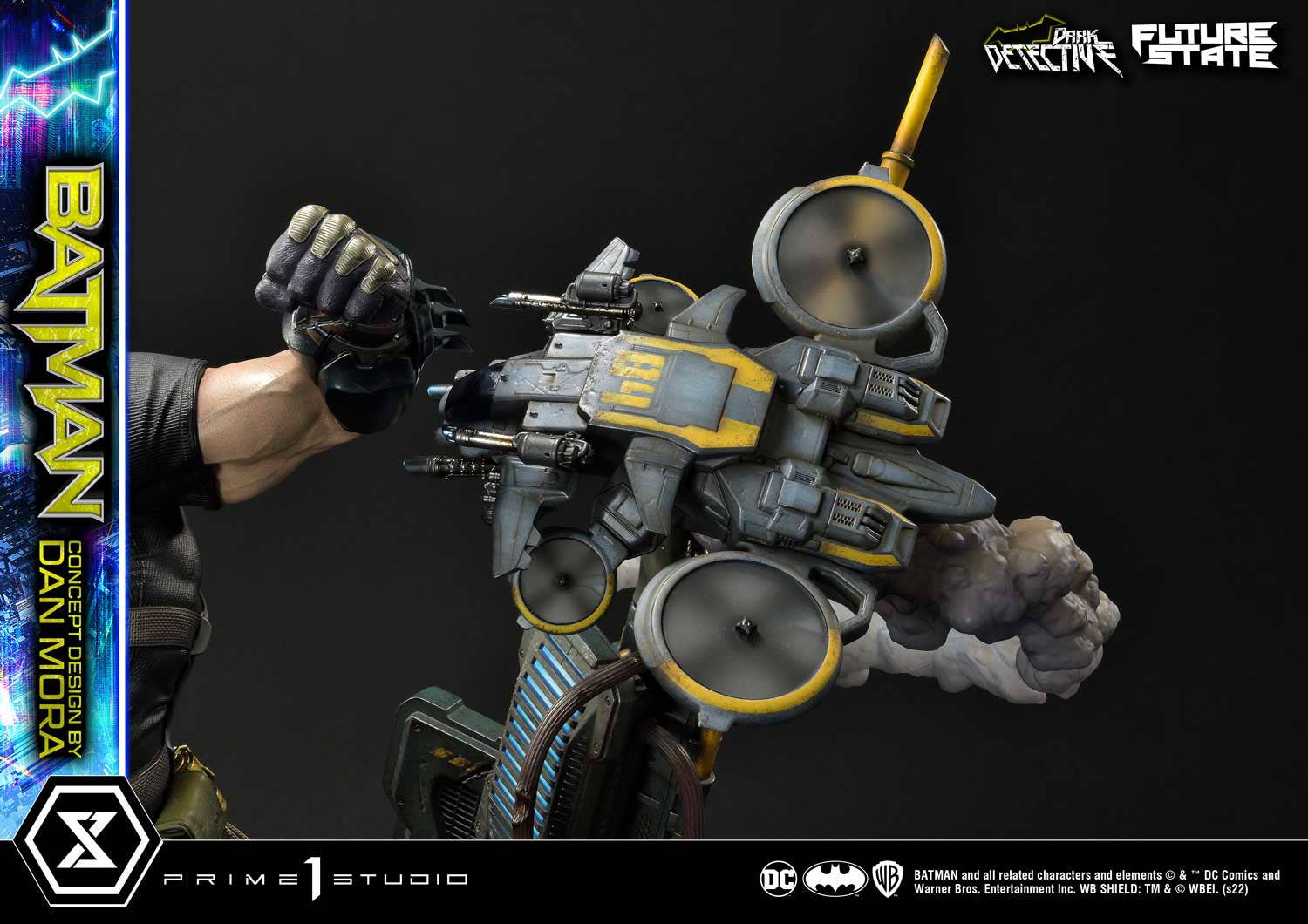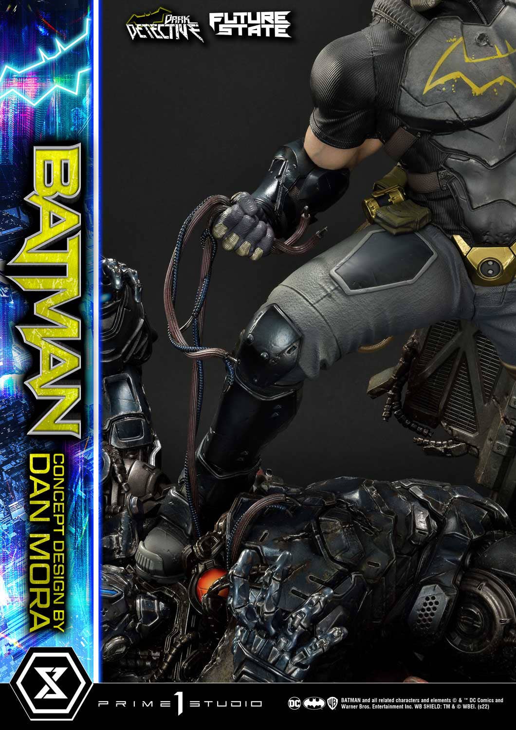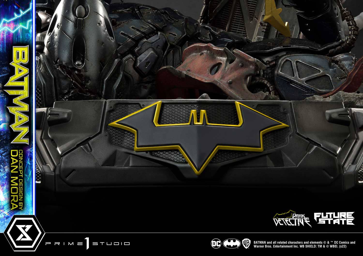 The stage is Gotham City in the DC Multiverse, and the enemy is the mysterious Magistrate. This amazing figure of Batman hails from "Dark Detective" from the "DC Future State" collection of short stories depicting a dystopian future! DC comic book artist Dan Mora collaborates with Prime 1 Studio to bring us this latest entry in the "Ultimate Premium Masterline" series, complete with attack drones emitting white smoke, a defeated humanoid robot, and Batman at the center of the composition, unleashing all-out blows! Batman has removed his coat to expose his high-tech bodysuit complete with plate armor; the texture of each part is reproduced without compromise, and the weathering and contrast in the paintwork is perfect. A military-like pouch and a holster are included that can be attached to the waist belt, too. Even the defeated Magistrate lying at his feet is highly detailed. Order this awesome presentation for your own collection today!