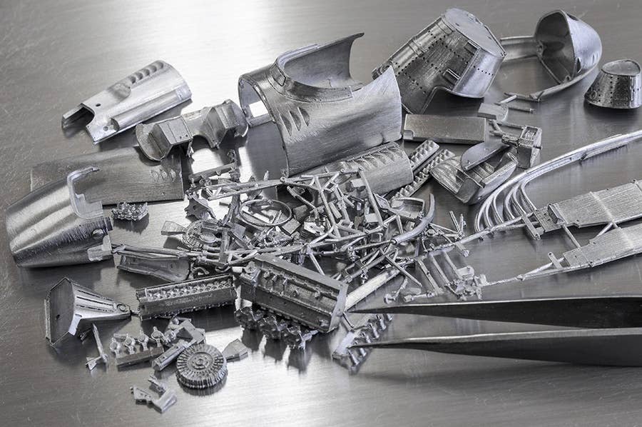 This is a racing car model kit assembled from parts made of resin, white metal, photo-etched metal and possibly other materials.