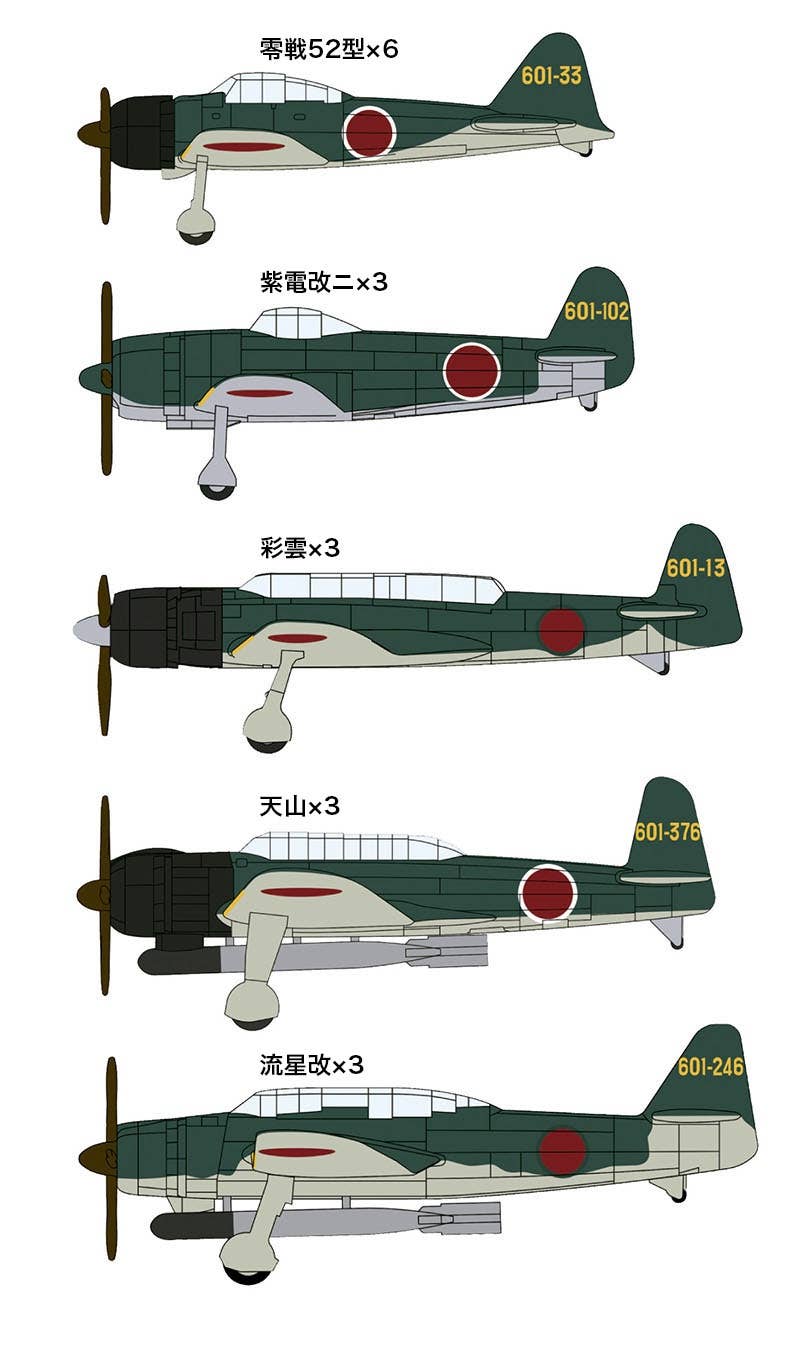 Aircraft delivered many of the decisive blows of the Pacific War. From Pearl Harbor to the bombings in Hiroshima and Nagasaki, the long range, striking power, and relatively low cost of aircraft made them the weapon of choice for combats in the far-flung reaches of the Pacific Ocean. A combination of dive bombers like "Grace", torpedo bombers like "Jill", "Myrt" recon, and fighters like "George" and the "Type 52" gave Japan a well-balanced and lethal striking arm. Kit features eighteen total aircraft: Zero Type 52 (6), "Grace" (3), "Jill" (3), "Myrt" (3), and "George (3).