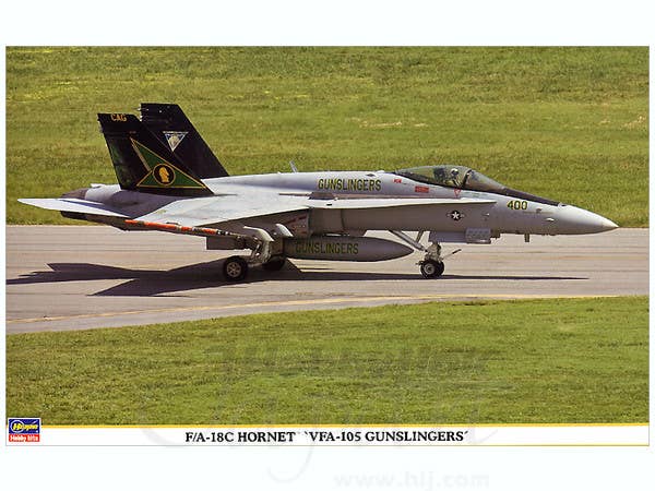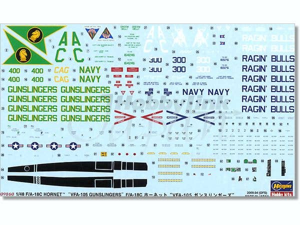 Limited reissue of the Hasegawa 1/48 scale F/A-18C kit with decals to mark it as either of two CAG birds: AC/400 of VFA-105 "Gunslingers" and AC/300 of VFA-37 "Ragin' Bulls". This kit includes the new "M" parts with new centerline pylon, swept antennas and GPS dome. See box photo or art for marking details.