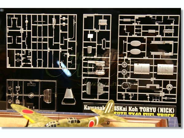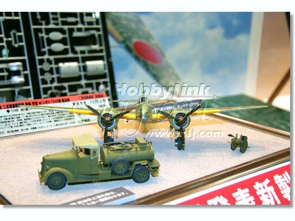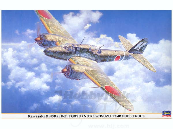 Here's an all-new tooling from Hasegawa--put those other 1/48 Nicks up in the loft! This kit features highly detailed cockpits with wing spars built into the cockpit floor for positive alignment of the wings, detailed engines and landing gear (including the gear bays), and optional canopy parts to allow you to build the canopies open or closed. Decals are given for two aircraft: the mottled aircraft of the 5th Flight Regiment, 1st Company on Timor in 1943, or an allover gray/green aircraft of the same unit at Kashiwa Airfield. Plus, this release also includes an Isuzu TX40 fuel truck, airfield fire extinguisher, two ground crew figures, and four drum cans. Decals and painting instructions are given for both IJA and IJN trucks.