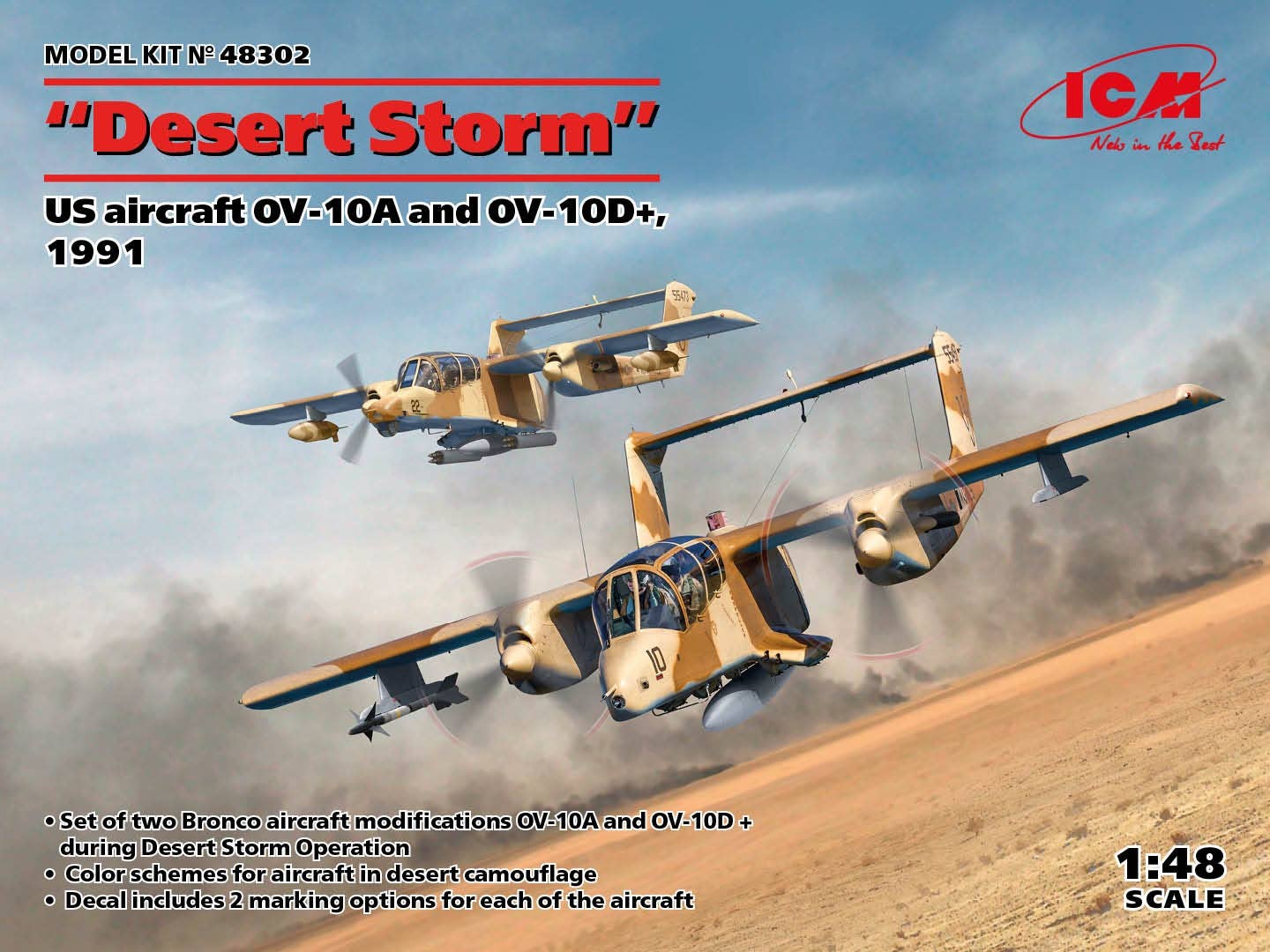 This model kit from ICM includes parts for two Bronco aircraft: an OV-10A and an OV-10D+ as seen during Operation Desert Storm. Decals are included for two markings schemes for each of the two aircraft, in desert camouflage colors. Order yours today!
