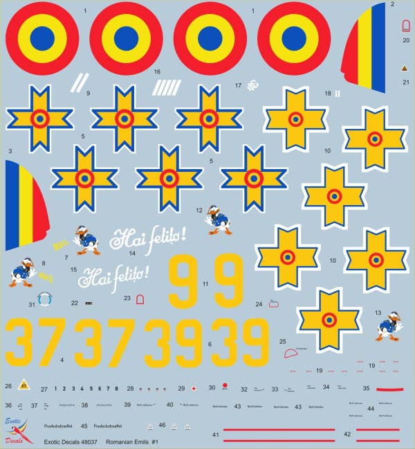 1/48 Romanian Emils #1 - Messerschmitt Bf 109E in Romanian service - part 1 - (3 different markings of three planes - decals enough for one model only)