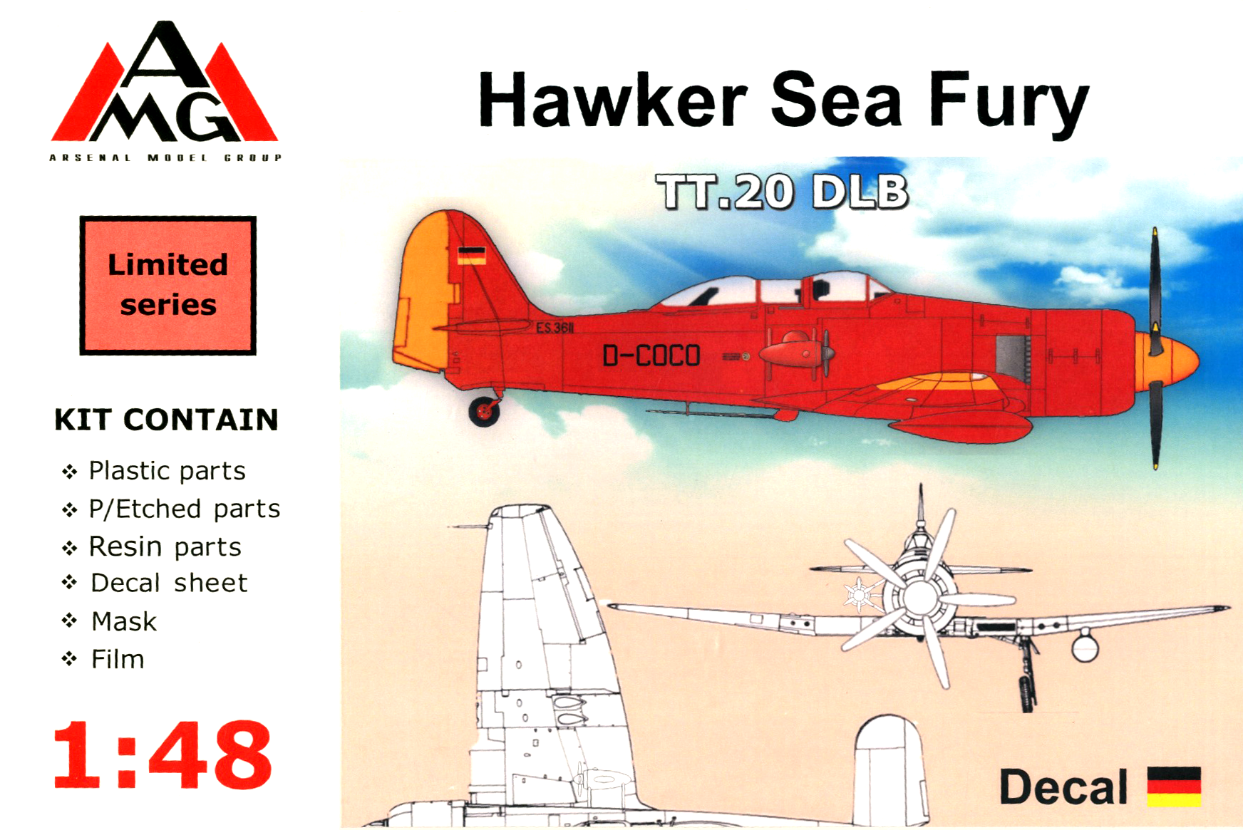 From Arsenal Model Group of the Ukraine comes this sharp kit of the Sea Fury TT.20 DLB. Molded in gray plastic, it includes photo-etch parts, resin parts, a painting mask, and decal markings.