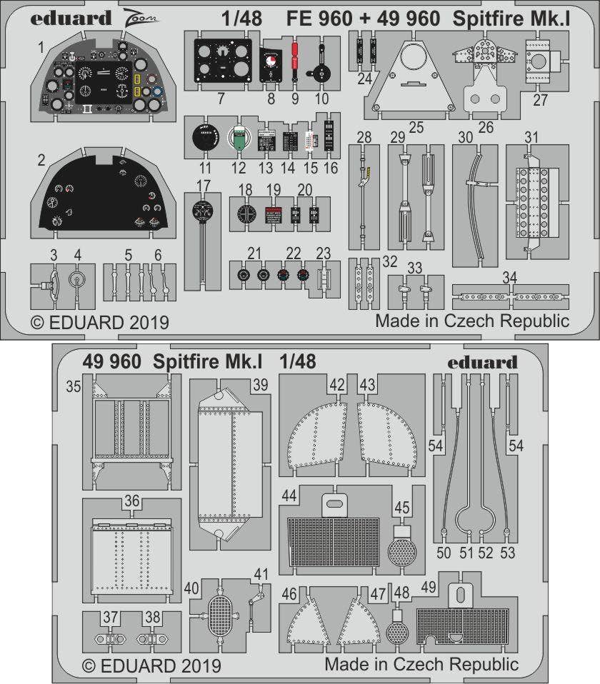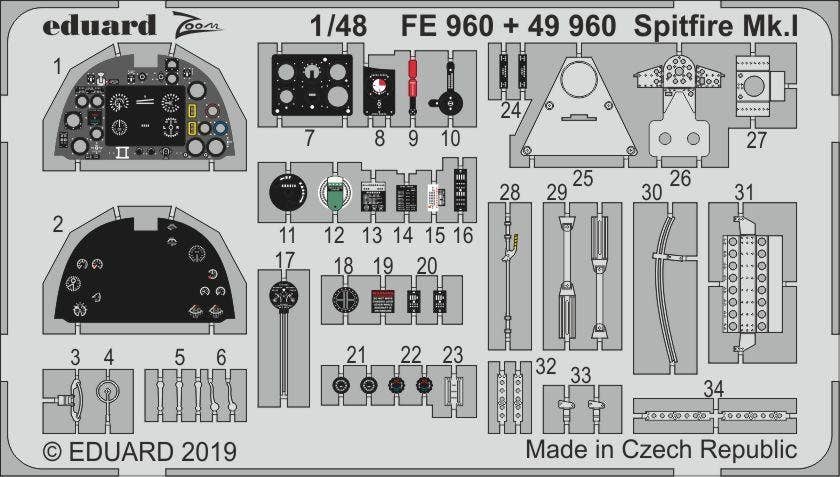 A set of high-quality photo-etched parts from Eduard for use with the 1/48 Spitfire Mk.I kit by Tamiya. Features some partially pre-painted parts.