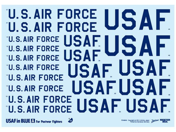The USAF and U.S. Air Force decals are typically printed in black for model kits, though the color used on real-life aircraft was "Insignia Blue" (FS15044) according to USAF references. These decals are printed in the proper shade of blue to help make your aircraft kits that much more realistic and accurate.