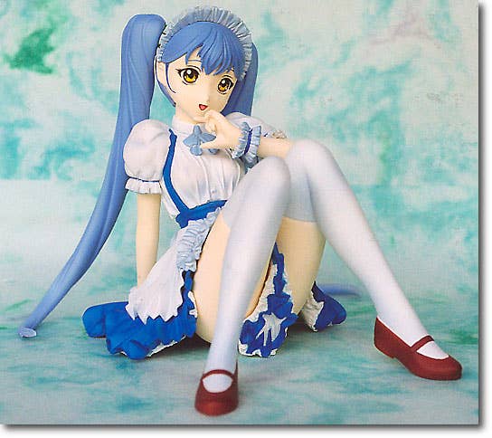 Completed and painted cold cast figure of Hoshino Ruri, in a blue maid uniform, sitting on the floor and looking much more shy and inviting than she ever did in the original series! Best of all, she's completed so beyond pulling her out of the box and setting her on display, you've got no work to do!