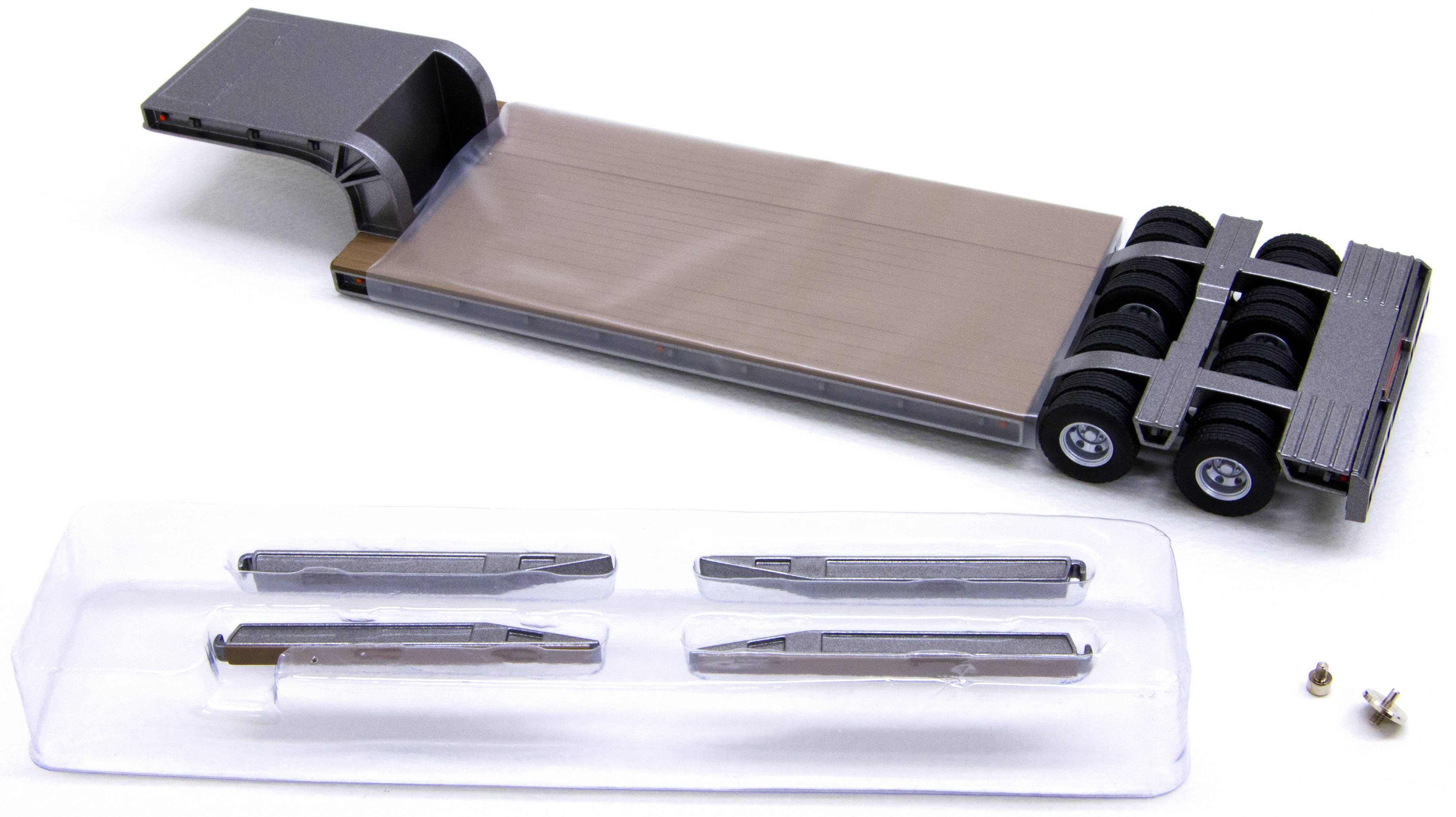Exquisitely reproduced in 1/50 scale, here's a die-cast 16-wheeled low bed trailer! Trailers of this type are a common sight here in Japan, carrying heavy equipment. This carefully crafted likeness measures about 250mm long by 64mm wide, is finished in a light gun metallic color, and is able to carry a load of up to 330 grams. Two types of connector pins are included to connect it to most 1/50-scale trucks. Just supply the truck and the load, and this trailer will be ready to work for you!