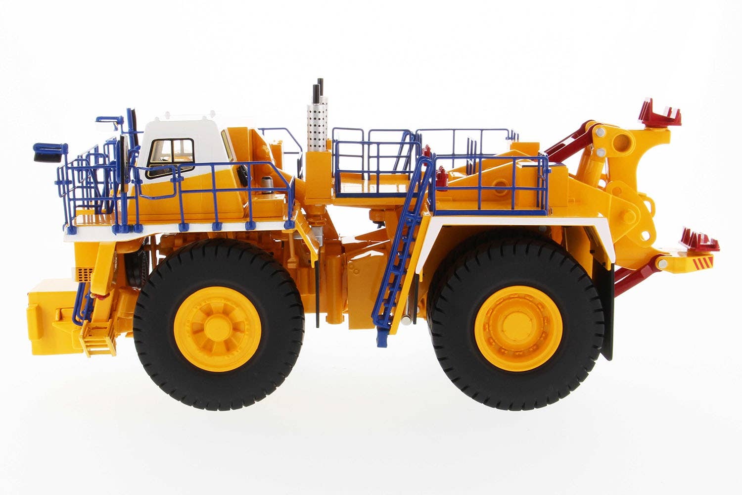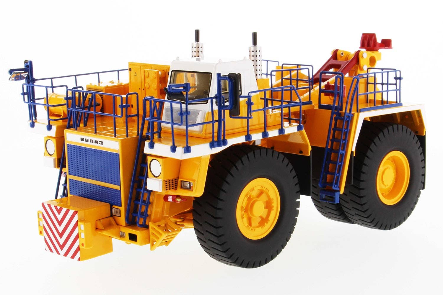 This item is a completely new mold! BelAZ is a Belarusian manufacturer of various transportation and civil engineering machinery established in 1948. A recovery tractor is a vehicle that pulls and moves vehicles that become stuck due to trouble. It's equipped with a Cummins KTA50-C engine, and can tow broken vehicles thanks to its over-1,600 horsepower. A counterweight is attached to the front to assist with towing especially large vehicles; due to its reliability, stability and sturdy structure, it is widely used at sites such as large open pit mines.