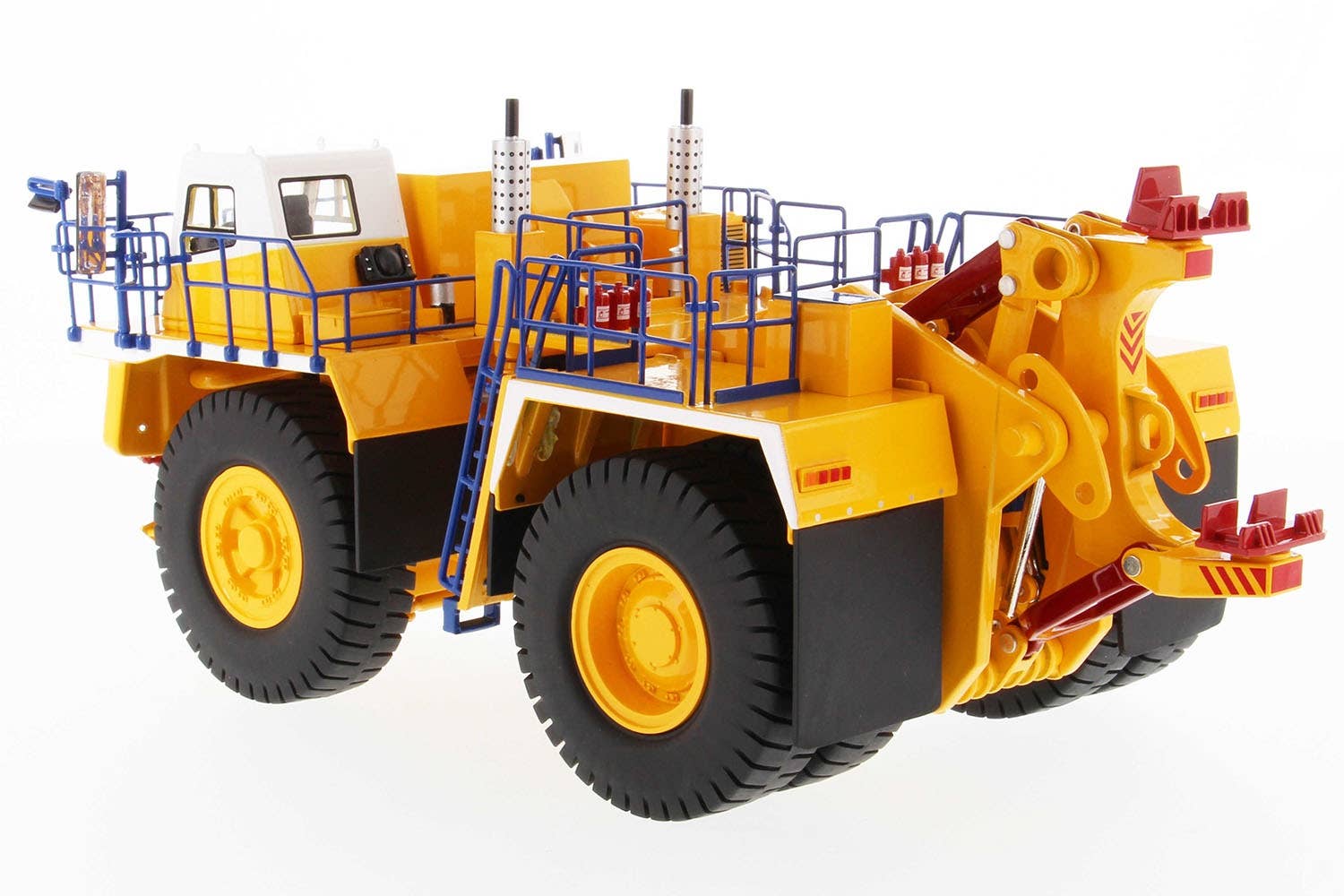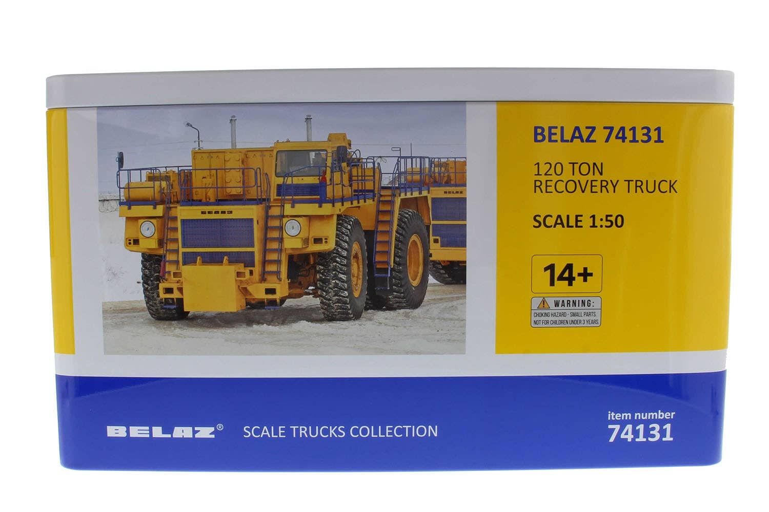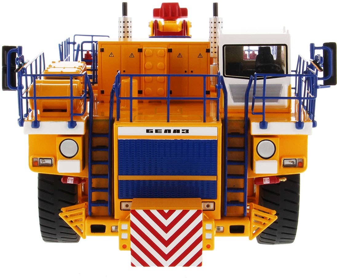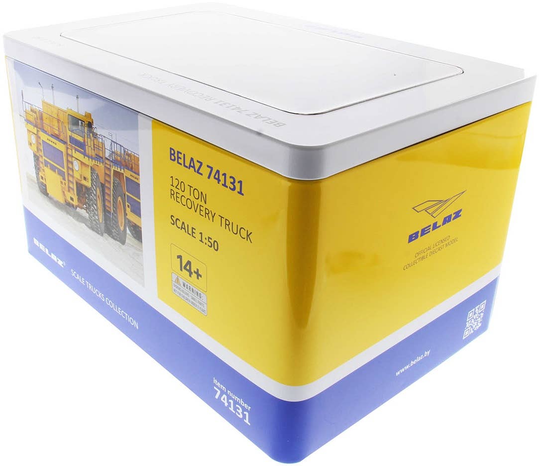 This completed die-cast display model reproduces the BelAZ 74131 recovery mine truck in 1/50 scale. The counterweight on the front and the powerful arm mounted on the rear are reproduced with great accuracy; the rear arm can be moved, too. Stairs leading to the operator's cabin and the handrails are also delicately modeled. The front wheels can be steered, and the tires feature a realistic tread pattern. The operator cabin interior is also carefully reproduced, and is clearly visible through the windows. Add this attractive and stylish piece of equipment to your collection today!