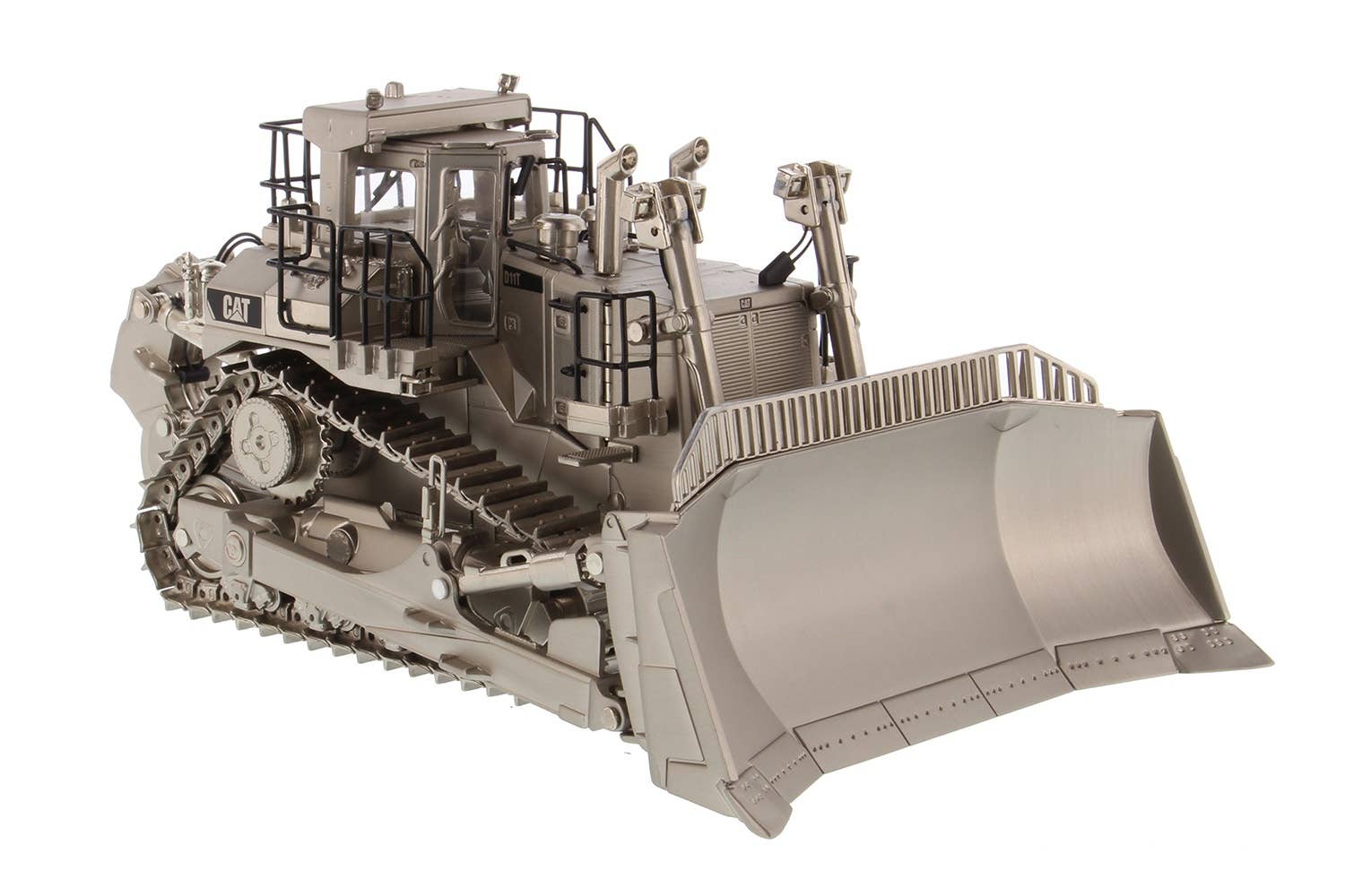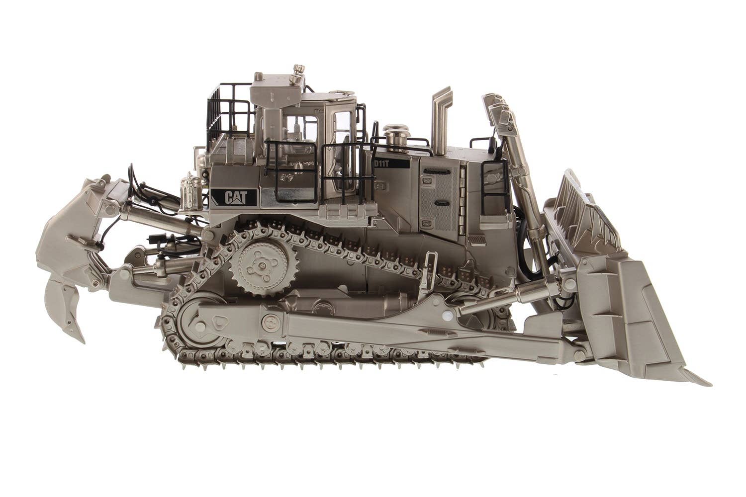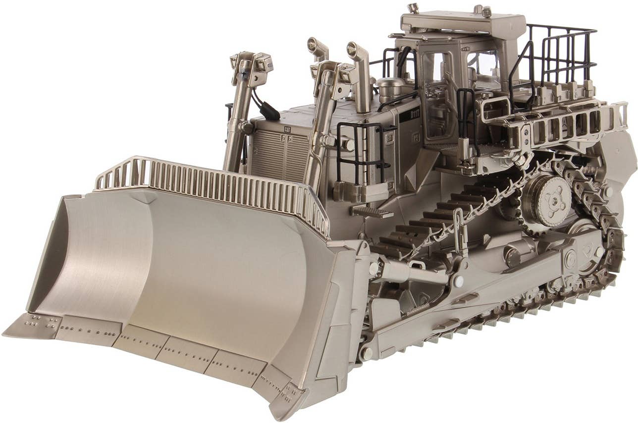 If you collect scale-model construction equipment, here's something truly special -- a Caterpillar D11T bulldozer finished with matte silver plating! The D11T is equipped with a single-shank ripper in back, and carries a V-type 12-cylinder 32-liter twin turbocharged diesel engine. It's used all over the world due to its relitable and stable performance and excellent operability.